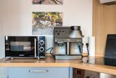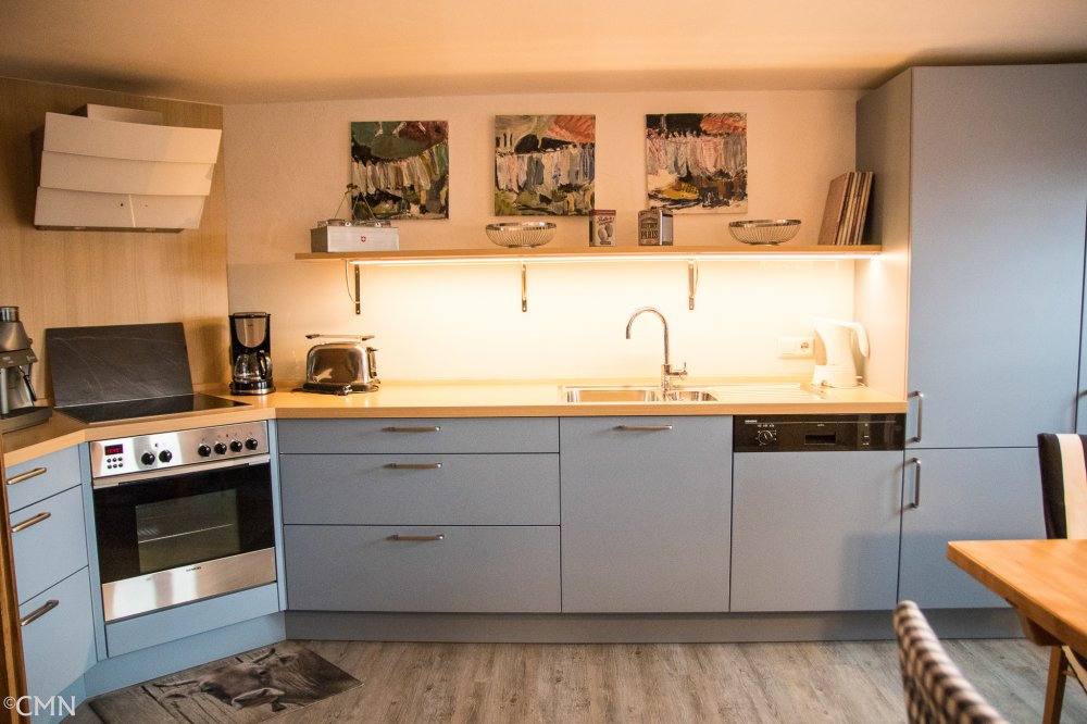 Es ist eine Maisonette Wohnung. Die sehr großzügige Wohnküche ist modern ausgestattet und mit Kamin und Eckbank sehr gemütlich. Im Wohnzimmer gibt es bequeme Sitzgelegenheiten, ein Fernseher und eine Stereoanlage. In diesem Stockwerk gibt es eine Dusche und WC.