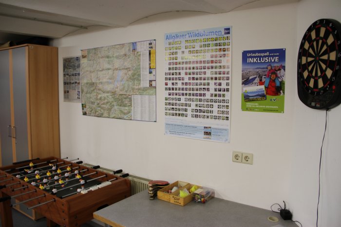 Der Hobbyraum lässt keine Wünsche offen. Tischtennis, Dart, Kicker, Turngeräte und Playmobilkisten.