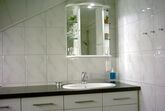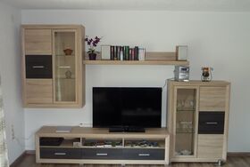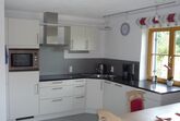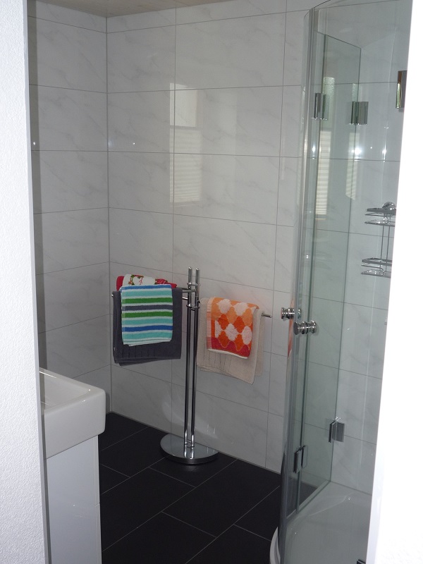 Die Wohnung im Erdgeschoss hat zwei Schlafzimmer für 5 Personen, eine eigene Küche und ein separates Wohnzimmer. Im Bad und räumlich getrenntem WC mit Glastür und jeweils einem Fenster ist ausgestattet mit Fußbodenheizung, großem Waschbecken und Dusche.