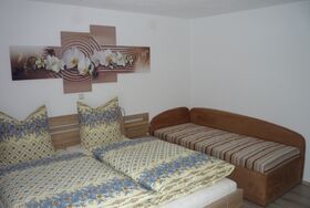 Die Dachgeschosswohnung verfügt über ein Schlafzimmer mit einem Doppelbett und ausreichend Stauraum in den Schränken. Im Gang und Bad sind Fliesen verlegt. Im Schlafzimmer, Wohn- und Küchenbereich ein pflegeleichter Laminat-Fußboden. Das gemütliche Sofa im Wohnbereich ist ausziehbar und bietet die Schlafgelegenheit für eine dritte und vierte Person.