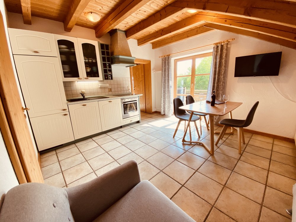 Ferienwohnung Grünten: Wohnküche, 2 Schlafzimmer mit Doppelbett und 2 Einzelbetten, Duschbad und großer Südbalkon