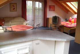 Großer Wohn- Schlafraum, separater Eingang, sichtbarer Dachstuhl, Bettwäsche und Handtücher werden gestellt.