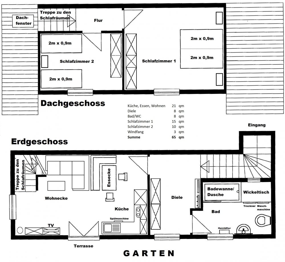 Die Ferienwohnung hat einen separaten Hauseingang. Über eine Treppe erreichen Sie den Wohn- und Küchenbereich mit ebenerdiger Terrasse zum Garten. Auf dieser Etage befindet sich auch das Badezimmer mit WC. Die 2 getrennten Schlafzimmer liegen im Obergeschoss.
