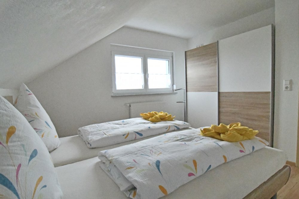 Unsere helle Ferienwohnung verfügt über zwei Schlafzimmer, Dusche/WC und eine voll ausgestattete Wohnküche mit Spülmaschine, Sat-TV, Radio und Ausziehsofa. Gerne stellen wir Ihnen kostenfrei ein Kinderbett und Hochstuhl zur Verfügung.