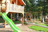 Im Sommer: Die Jachen, vorm Haus mit der Wasserrutsche lädt ein zu echtem Badevergnügen. Idealer Ausgangspunkt für bequeme sowie anspruchsvolle Wanderungen.