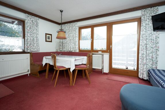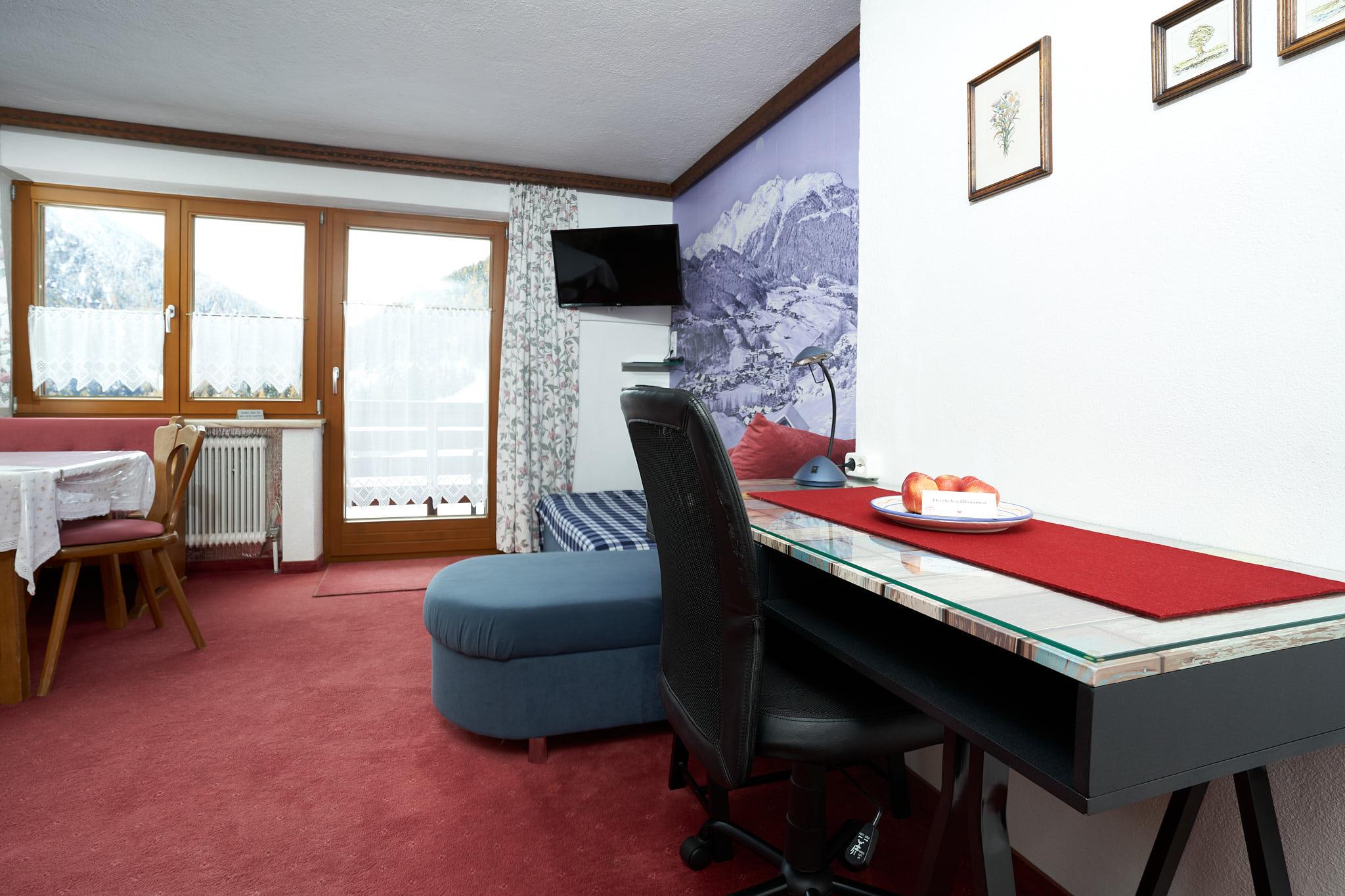 Gemütlich eingerichtetes Appartement (55m2) mit Schlafzimmer(Doppelbett,Einzelbett), Wohn-/Schlafzimmer (Schlafcouch); Küche mit Küchenbar, Duschbad/WC, Garderobe; Südbalkon mit unverbauter Aussicht auf die Bergwelt; Sat-TV,Safe, Haarfön; komplette Küchenausstattung -Microwelle,Kaffeemaschine,Spülmaschine,etc.-