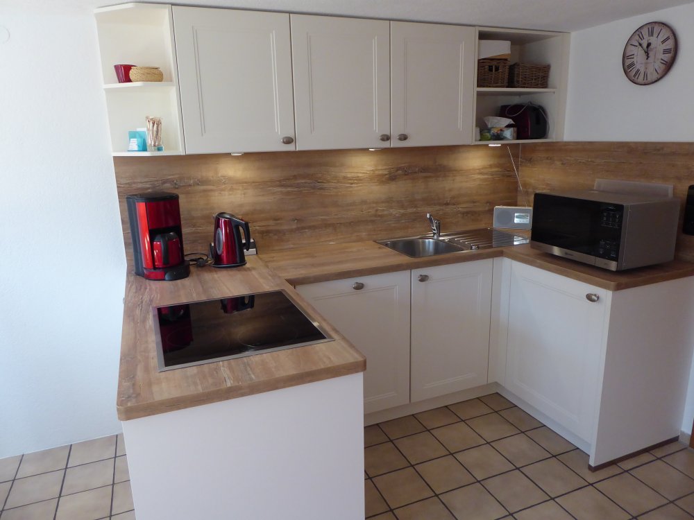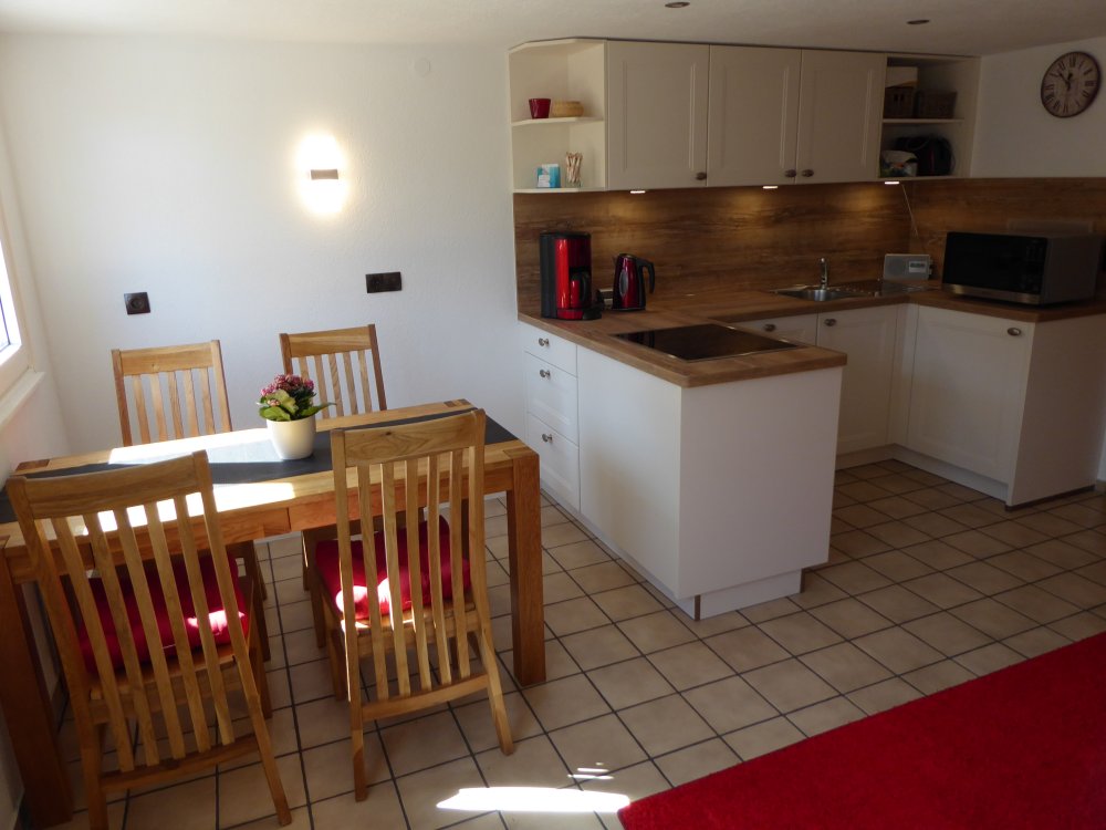 Unsere Ferienwohnung Bodensee ist mit einer modernen Wohn-Essküche ausgestattet. In der komplett eingerichteten Einbauküche finden Sie eine integrierte Geschirrspülmaschine die Ihren Abwasch übernimmt, Mikrowelle, Kühlschrank mit Gefrierfach, Cerankochfeld, Backofen mit Heißluft und Grillfunktion. Küchengeräte wie Kaffeemaschine, Toaster und Wasserkocher gehören selbstverständlich in eine gut gerüstete Küche. Es ist ausreichend Geschirr und Besteck sowie diverse Kochutensilien vorhanden.