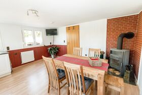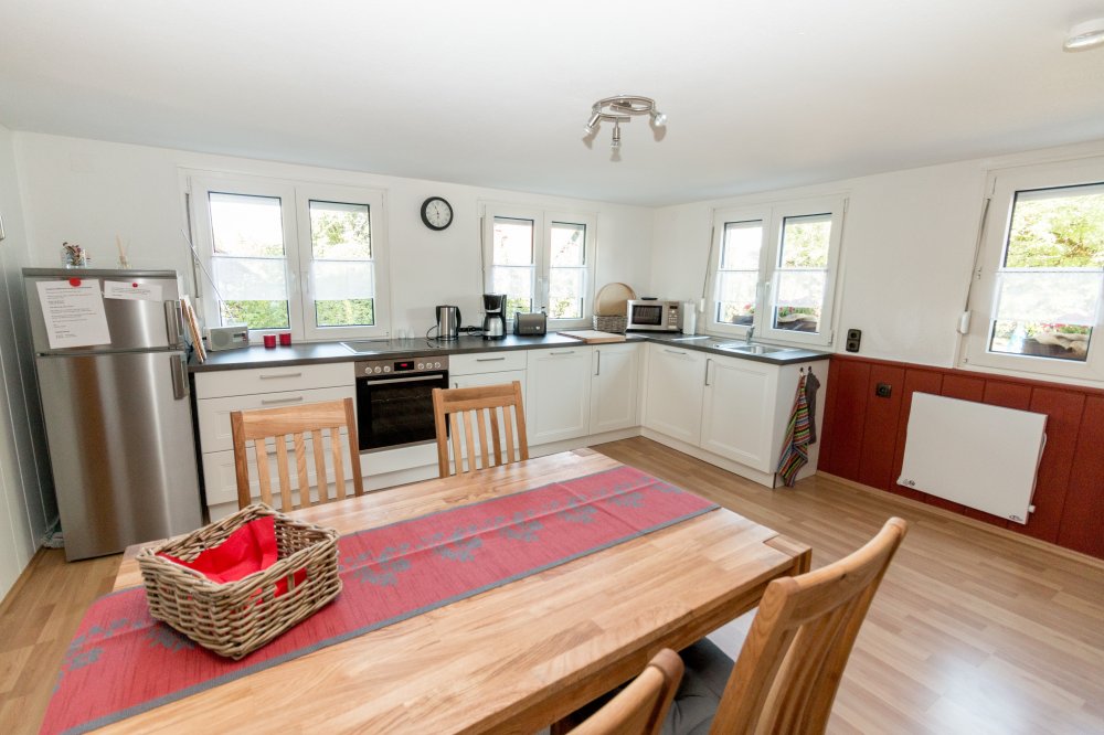 Damit Sie sich Ihre Leckereien wie zu Hause entspannt zubereiten können, wurde eine hochwertige Küche mit Schwedenofen eingebaut. In der komplett eingerichteten Küche finden Sie eine integrierte Geschirrspülmaschine die Ihren Abwasch übernimmt, Mikrowelle, Kühlschrank mit Gefrierfach, Cerankochfeld, Backofen mit Heißluft und Grillfunktion. Küchengeräte wie Kaffeemaschine, Toaster, Wasserkocher gehören selbstverständlich in eine gut gerüstete Küche. Es ist ausreichend Geschirr und Besteck sowie diverse Kochutensilien vorhanden.