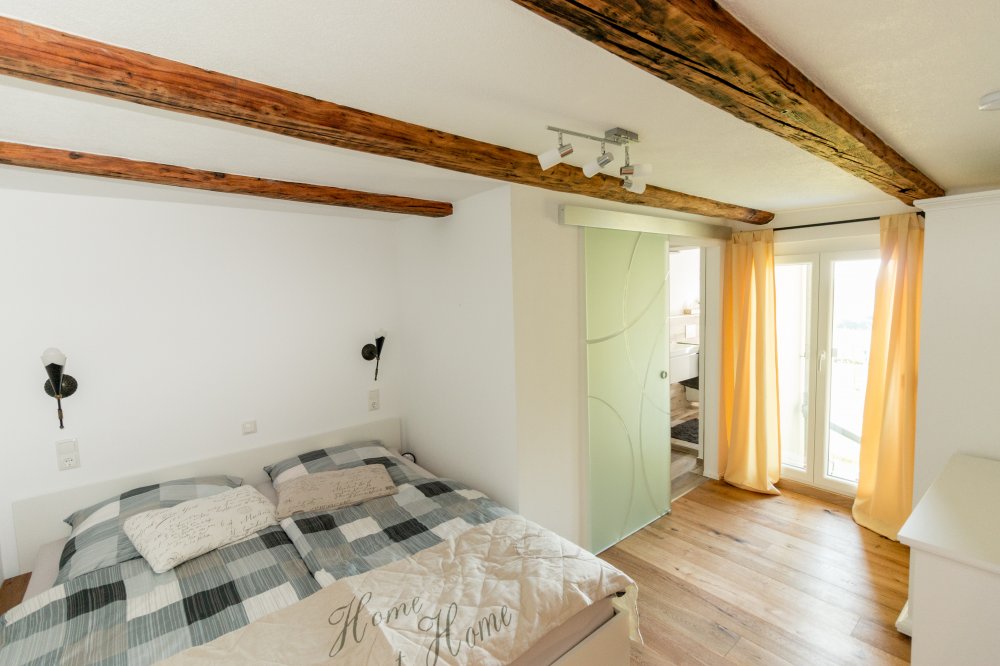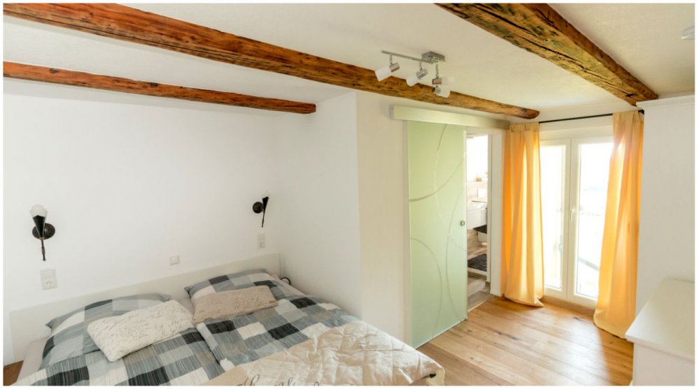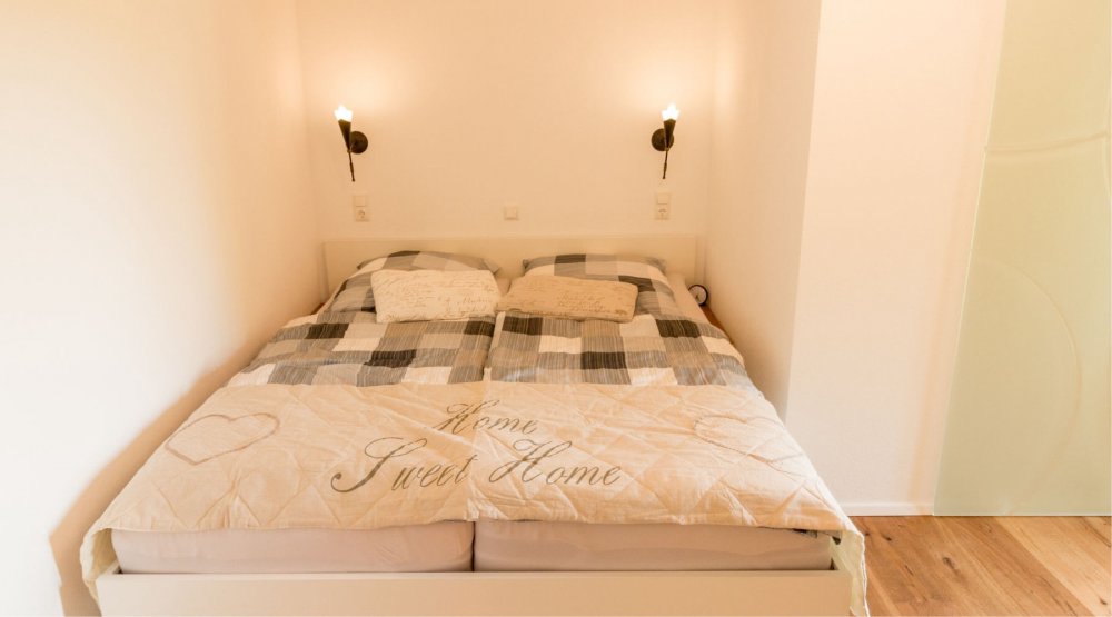 Das Schlafzimmer mit angrenzendem Bad ist im Allgäuer Stil eingerichtet. Zum Entspannen nach den Ausflügen erwartet unsere Urlaubsgäste ein komfortables Bett. Das Bett ist bereits mit schöner Bettwäsche bezogen. Für unsere ganz kleinen Gäste ist ein Kinderbett vorhanden. Kein Autolärm stört die Nachtruhe und am Morgen wird man mit Vogelgezwitscher geweckt. Sie können in Ruhe mit offenem Fenster schlafen - das nennt man Urlaub.
