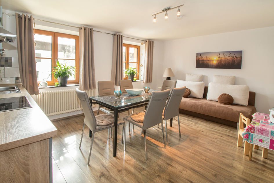Diese Ferienwohnung verfügt über einen Balkon mit einem weitläufigen Blick auf die Ratzinger Höhe und die Umgebung des Hofes.