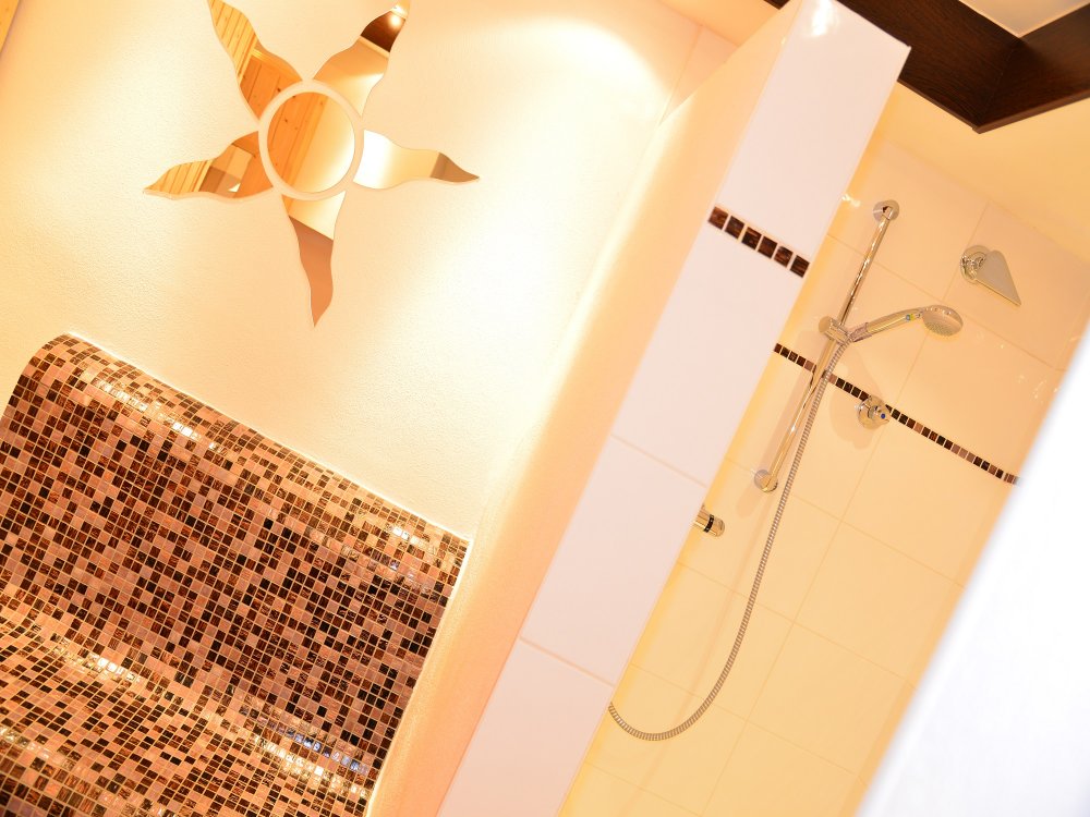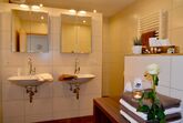 Das Badezimmer mit begehbarer Dusche, WC, 2 Waschbecken, Handtuchtrockner und Fußbodenheizung komplettiert Ihre Ferienwohnung.