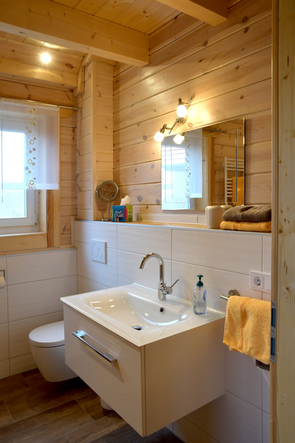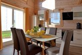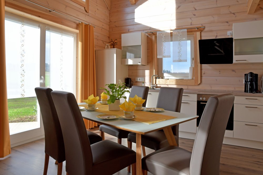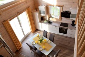Sie wohnen in einem unserer wunderschönen, neuen Blockhäuser. Im EG befindet sich ein großer Koch-/Ess- und Wohnbereich