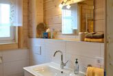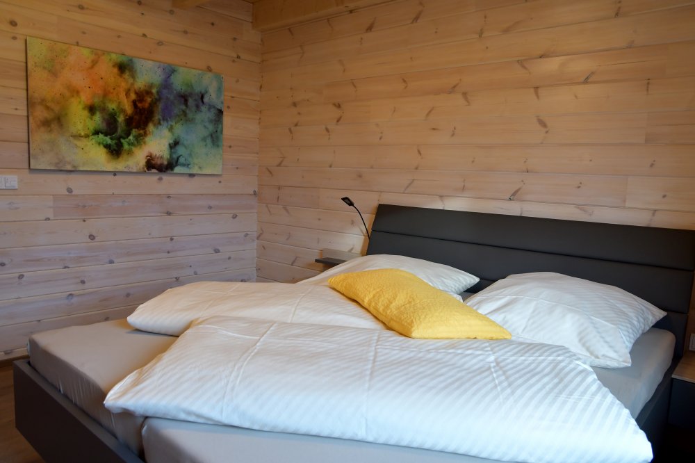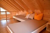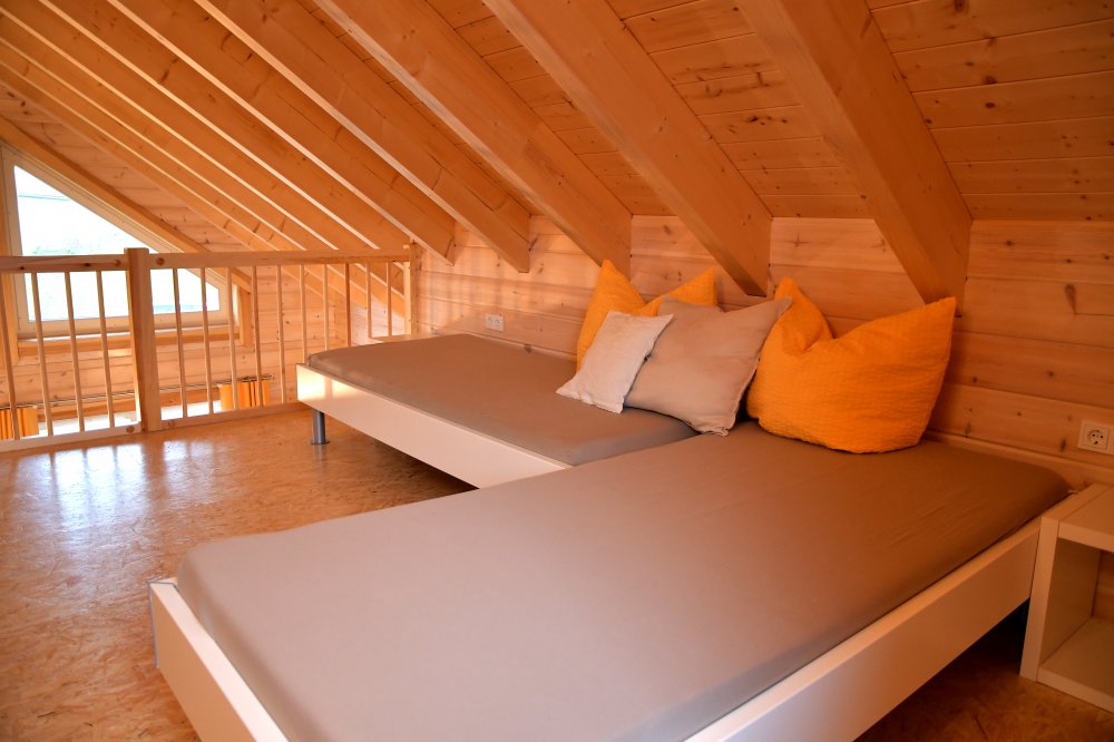 das Bad und ein separates WC. Im OG gibt es ein Schlafzimmer mit zwei Einzelbetten und eine offene Galerie mit zwei Zustellbetten.