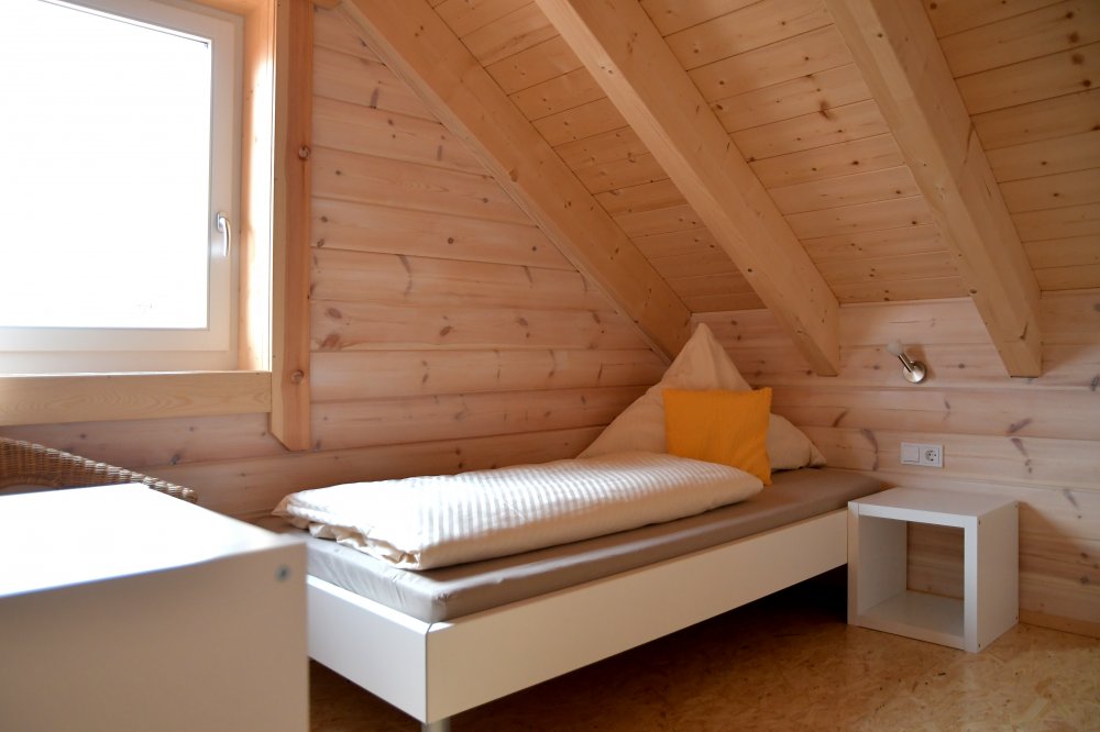 Auf 80 m² bietet das Ferienhaus 4 Personen ausreichend Platz (maximale Belegung bis zu 6 Personen möglich). Im EG befindet sich der große Koch-/Ess-/Wohnbereich mit Kaminofen, ein Schlafzimmer mit Doppelbett, ein Badezimmer mit Fenster,Dusche, WC und zusätzlich ein separates WC. Im OG gibt es ein weiteres Schlafzimmer mit zwei Einzelbetten, sowie eine offene Galerie mit zwei Zustellbetten.