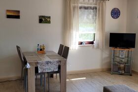 Das innenliegende Badezimmer ist mit einer Dusche, WC und einem doppelten Waschbecken ausgestattet. Auf Wunsch kann die hier vorhandene Waschmaschine genutzt werden. In dem großzügigen Wohn- und Essbereich befindet sich neben dem Essbereich für 4 Personen auch ein bequemer Wohnbereich mit einem Smart TV. Von hier aus gelangen Sie direkt in die voll ausgestattete Küche. Kostenfreies WLAN ist selbstverständlich auch vorhanden.