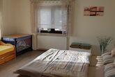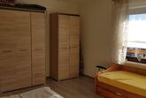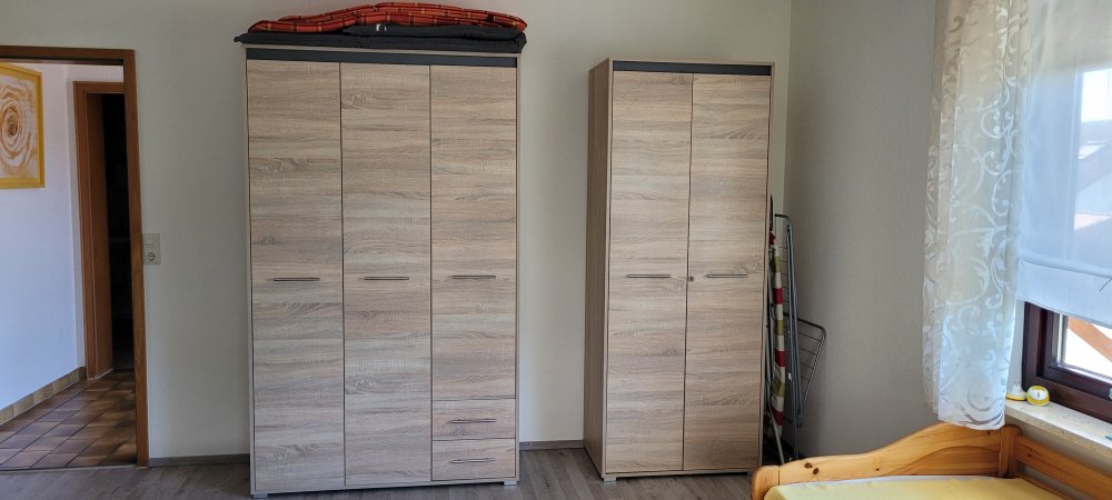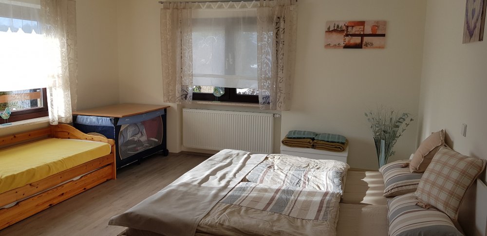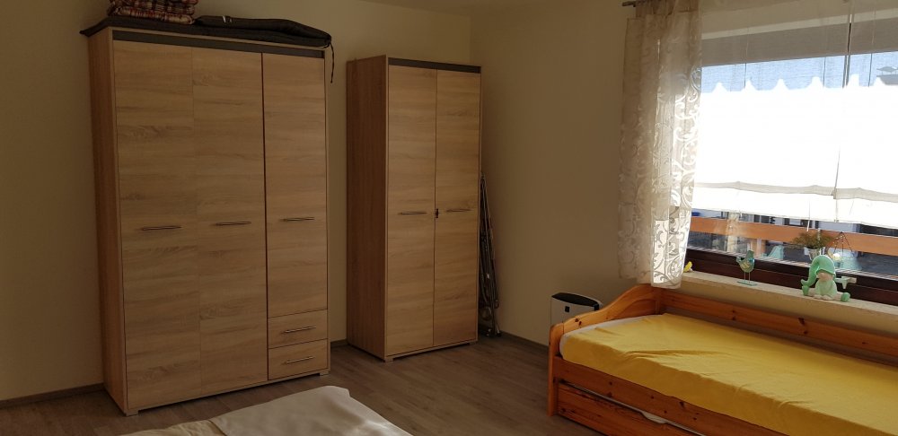 Im großen Schlafzimmer befinden sich ein Doppelbett, ein Einzelbett sowie ein Baby-Reisebett. Es bietet sich die Möglichkeit das Babybett gegen ein weiteres Einzelbett auszutauschen.