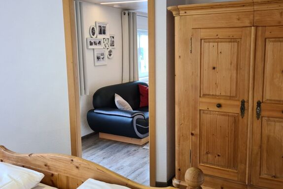 Dies helle, modern eingerichtete Dreiraumwohnung liegt im zweiten Stock im Bauernhaus. In den separaten Schlafzimmern geben alte Vollholzmöbel ländlichen Charakter. Das Kinderzimmer liegt in der Dachschräge und hat zwei Einzelbetten. Die Wohnküche hat zwei Fenster nach Osten mit herrlichem Blick in die Berge. Die lange Küchenzeile bietet viel Stauraum und Platz zum Kochen.