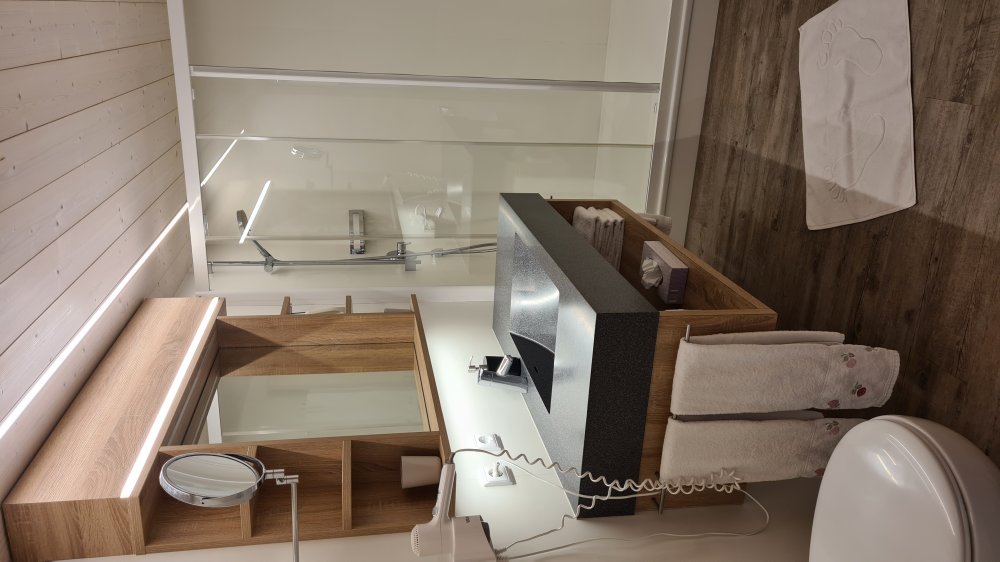 Bad: Dusche, WC, Föhn, Vergrößerungsspiegel, Badetuch, Handtücher