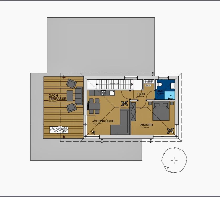 Fühlen Sie sich wie daheim im 50 m² großen Appartement. Das Highlight dieses Appartements ist die 28 m²