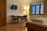 Ihr gemütliches Zweibettzimmer mit Balkon, verfügt über zwei Betten in Größe 90x200 cm, einen Kühlschrank, eine Sitzecke mit TV und ein Badezimmer mit Dusche und WC.