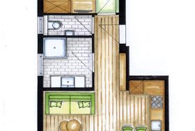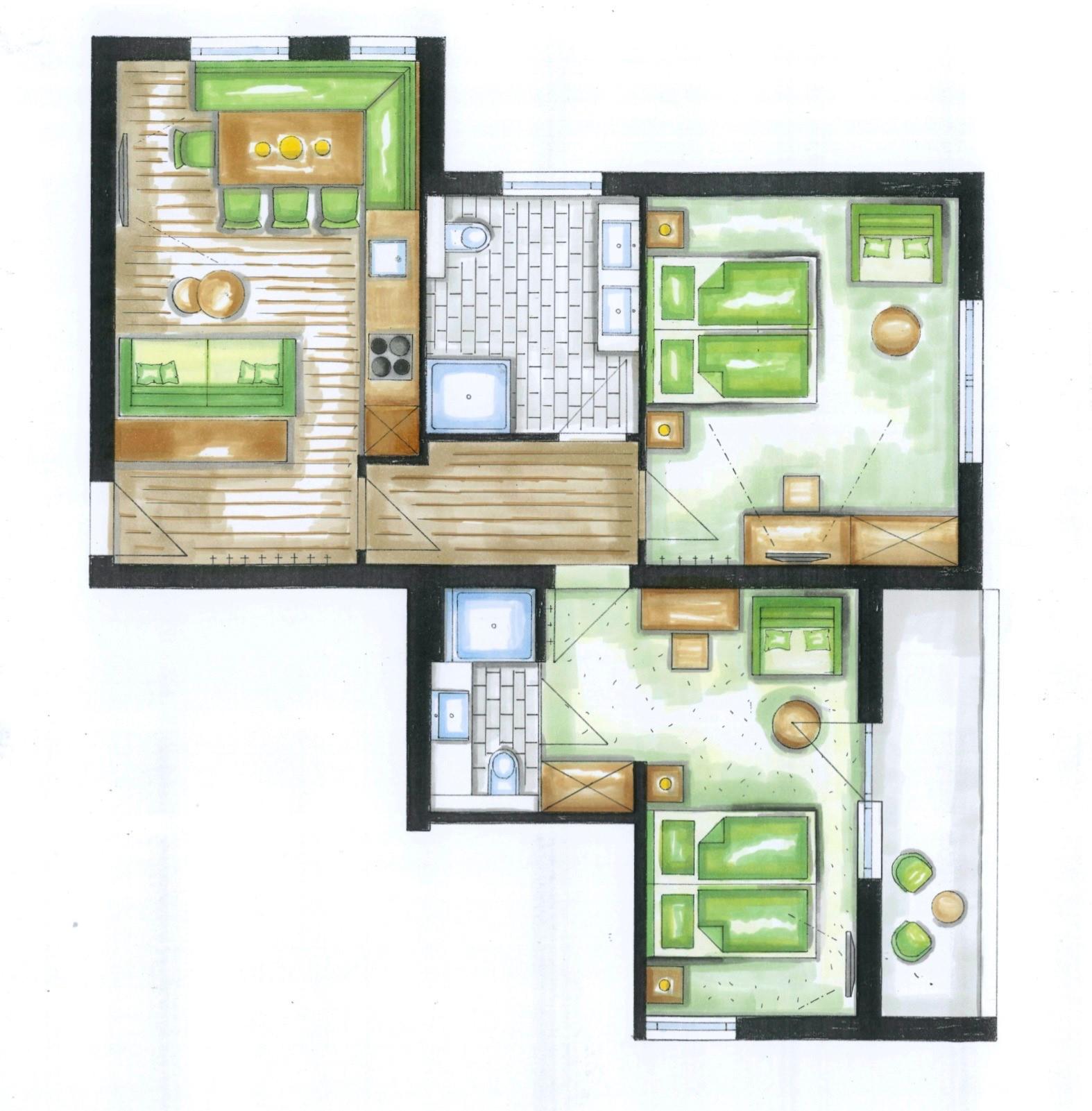 Das Apart TOP 1 mit ca. 43 m² besteht aus: 1 Doppelzimmer; 1 komplett ausgestattete Wohnküche inkl. Essbereich und Wohnbereich mit Schlafcouch (für 3. + 4. Person); 1 Badezimmer mit Dusche; 1 separates WC;