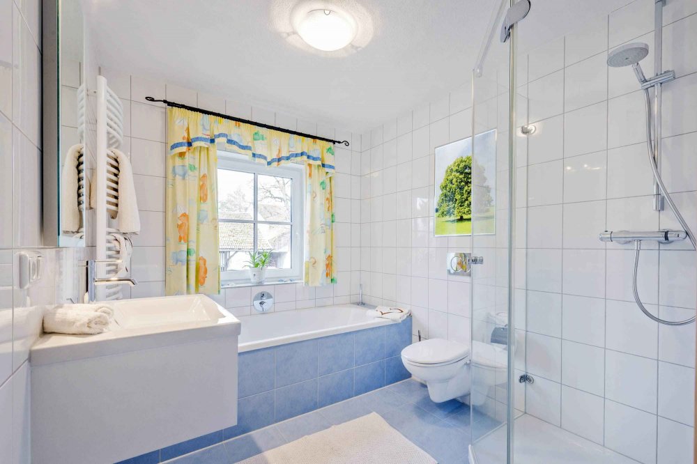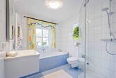 modernes Badezimmer mit WC/ Dusche und Badewanne, Fön