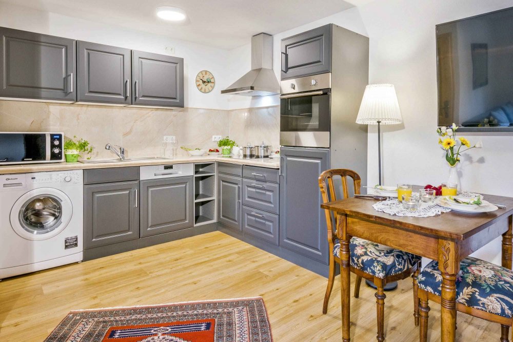 komplett ausgestattete Wohnraumküche mit E-Herd, Backofen, Kühlschrank