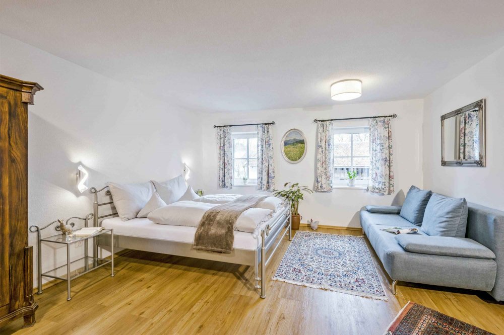 komfortables Schlafzimmer mit Doppelbett und Sofa