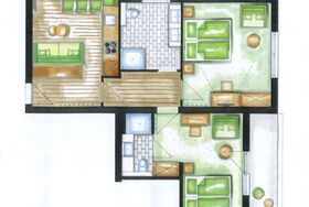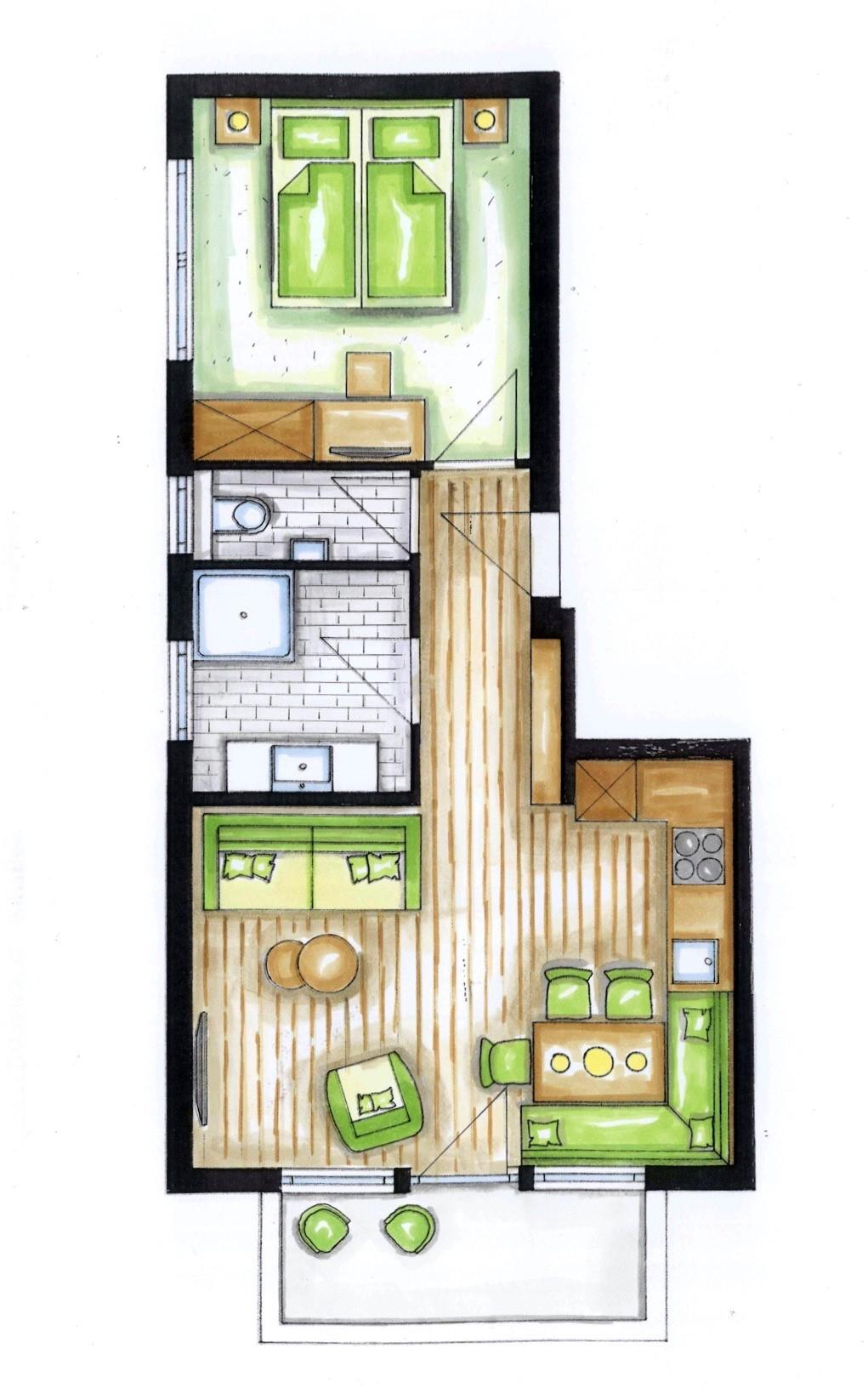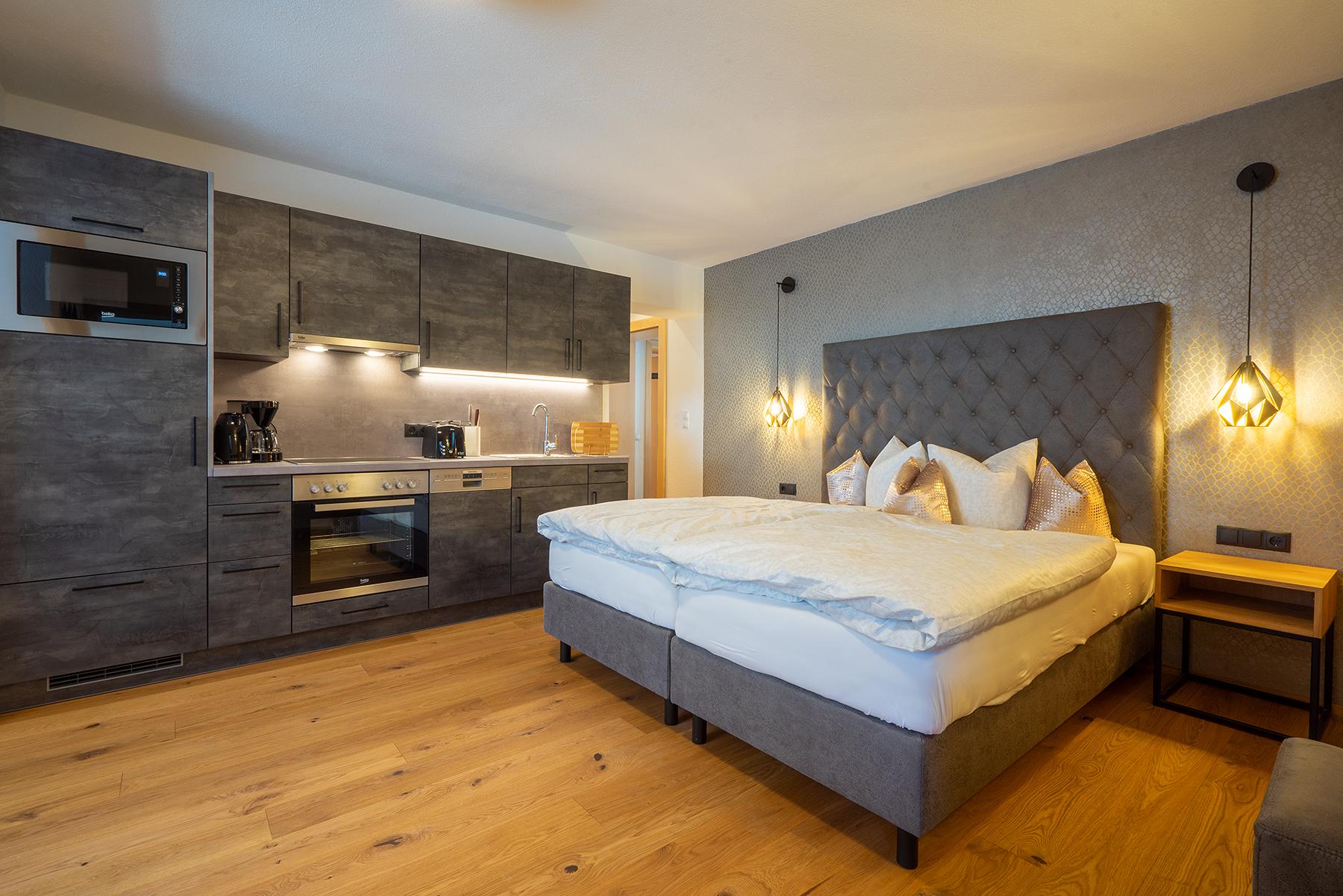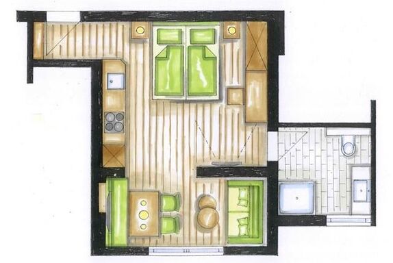 Unser gemütliches Studio Apart mit ca. 33 m² besteht aus: 1 Doppelzimmer mit Sat-TV und inkl. komplett ausgestattete Kochnische; kleiner Wohn- und Essbereich inkl. Sat-TV und einem Schlafsofa für eine weitere Person; 1 Badezimmer mit Dusche und WC;