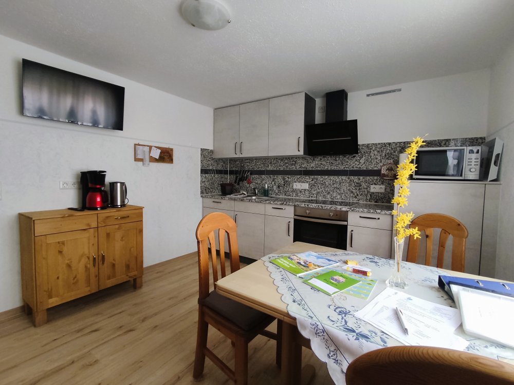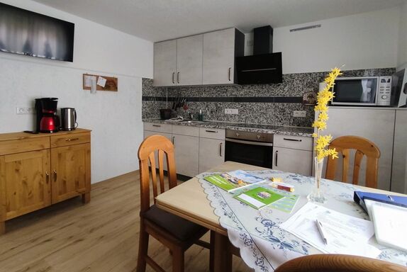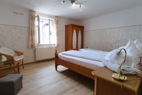 Die Ferienwohnung Vergissmeinnicht liegt im 1. OG des ehemaligen Bauernhauses. Sie erwartet eine liebevoll eingerichtete Fewo mit einer gut eingerichtete Wohnküche und einem Schlafzimmer mit Doppelbett (180x200) und einem Einzelbett (90x200). Das Badezimmer verfügt über eine Dusche und WC. Sie haben Zugang zum Balkon.