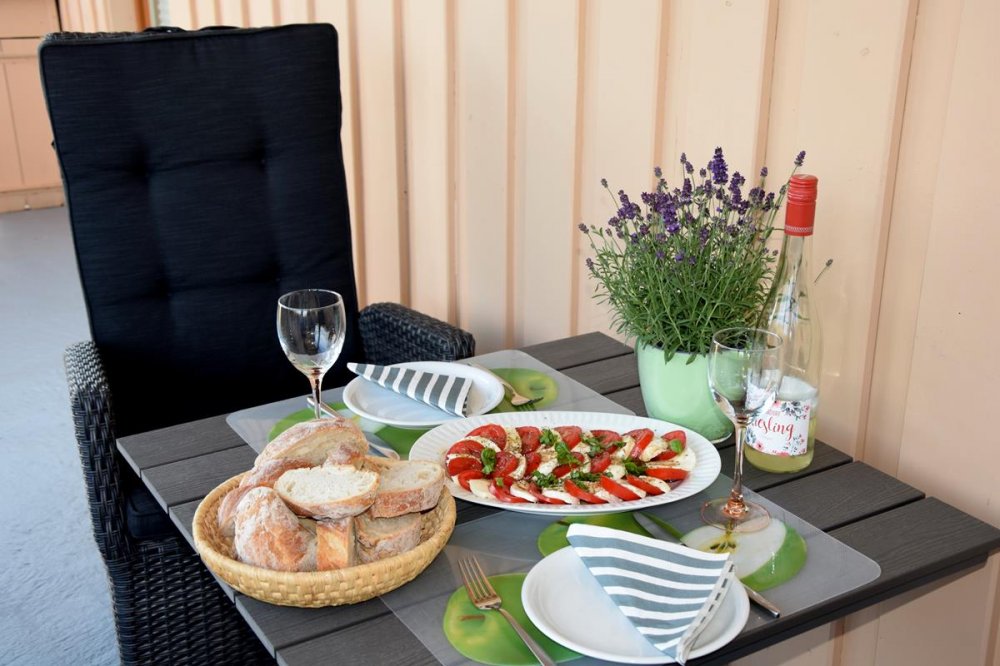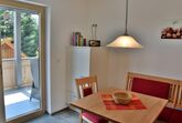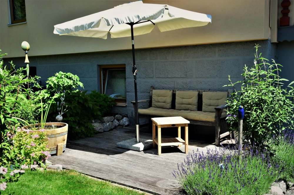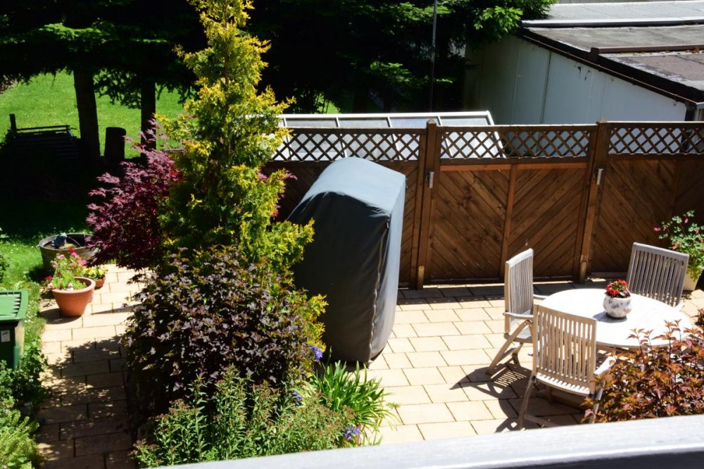 Der 16 qm große, überdachte Balkon mit Blick in den gepflegten Garten und urbanen Nebengebäuden wie ehemaliges Bienenhaus bietet selbst bei warmen Regenwetter einen Aufenthalt im Freien. Ausgestattet mit einem Tisch und dazugehörigen verstellbaren Hochlehnern kann das Frühstücken und sonstiges Essen nach Draußen verlegt werden.