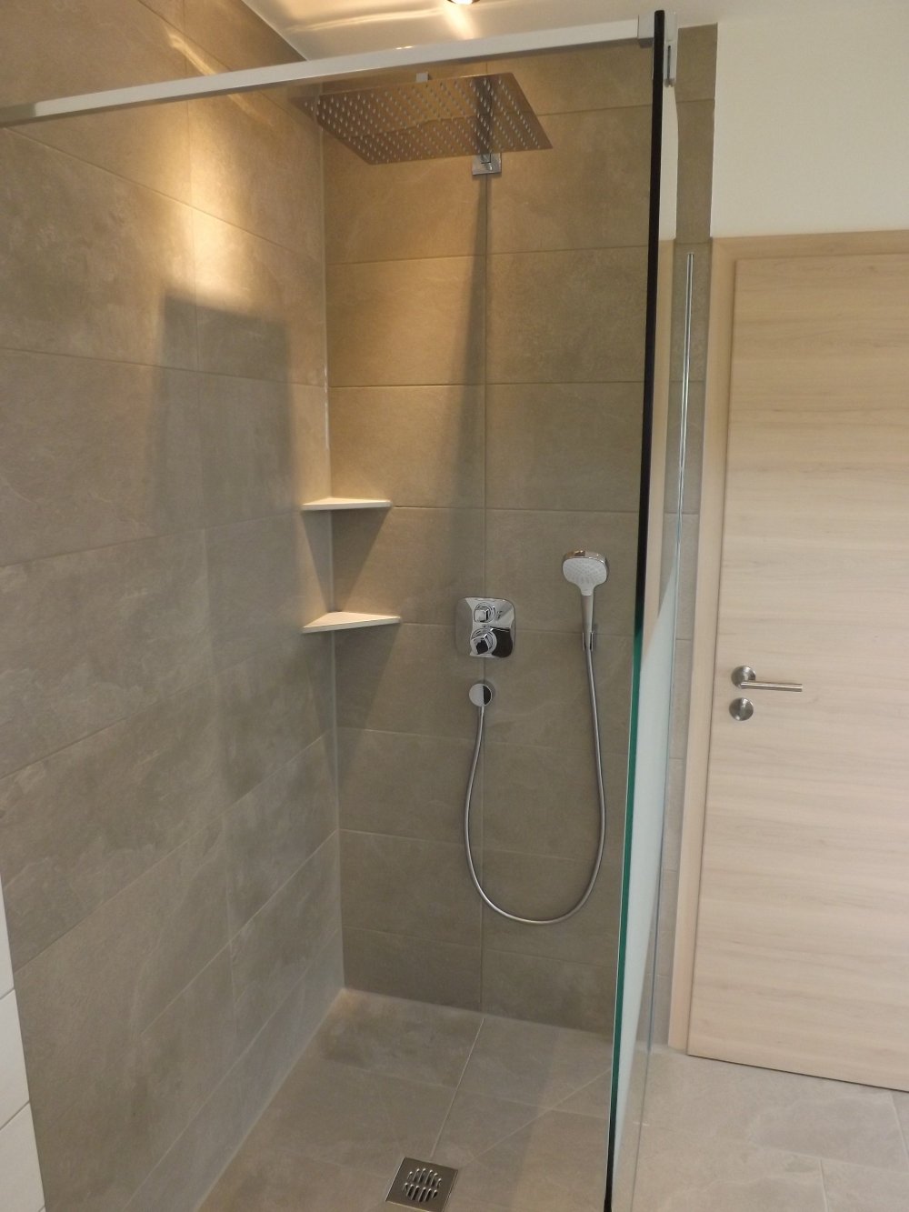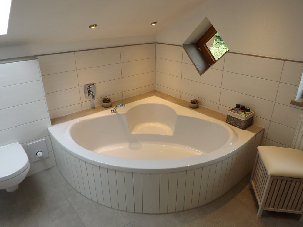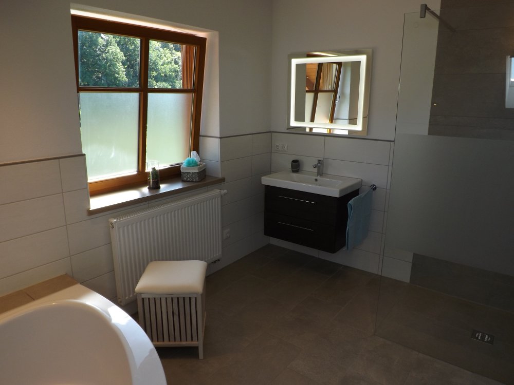 Das Badezimmer ist mit eingebauter Eckbadewanne, ebenerdiger Regendusche, Waschbecken, WC und Comfort-Radio ausgestattet, plus separates Gäste-WC.