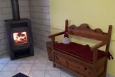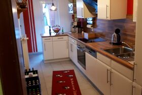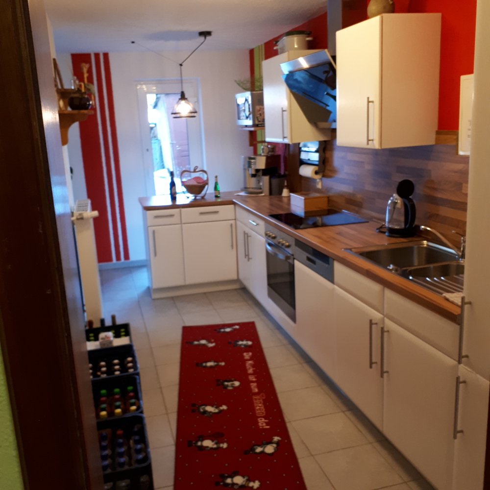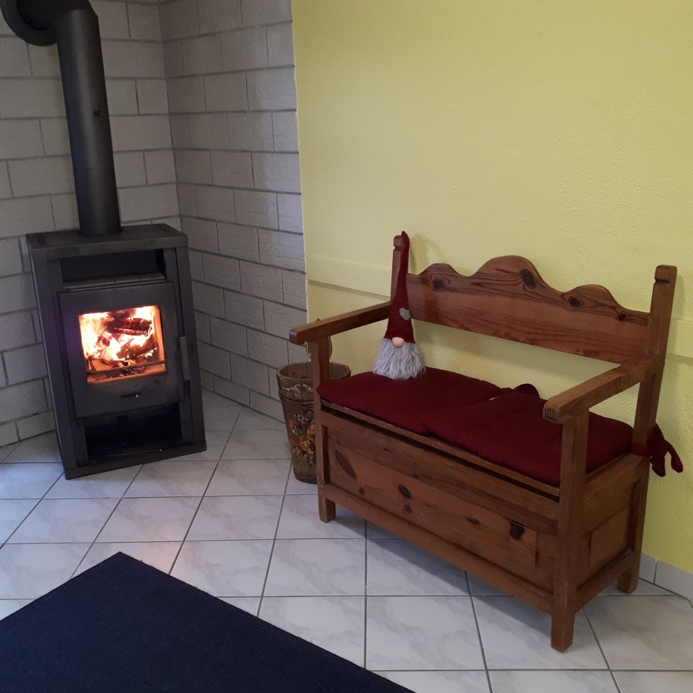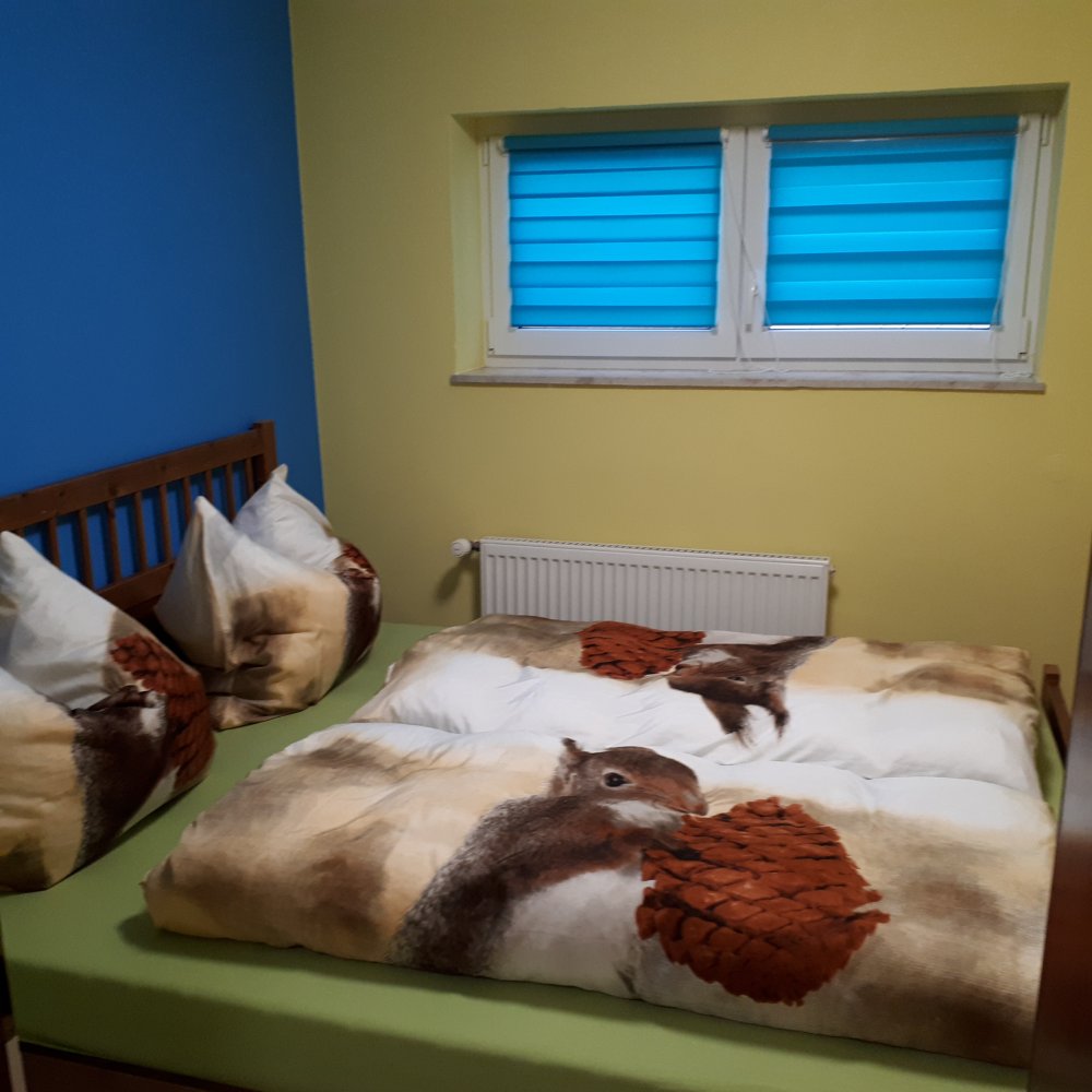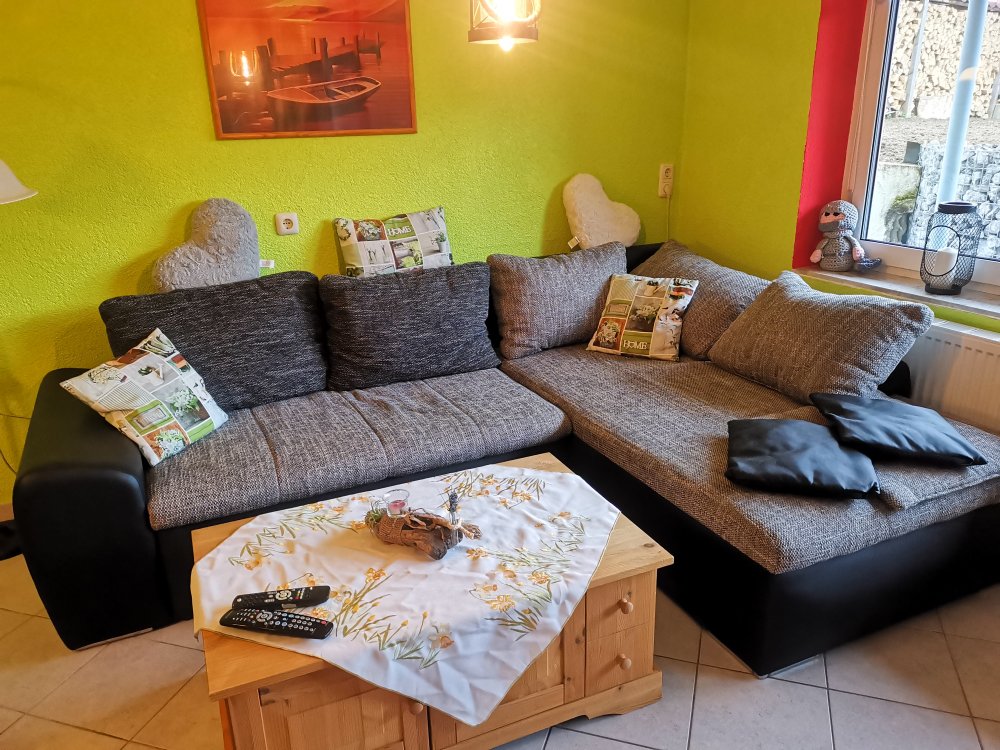 Die Ferienwohnung befindet sich im Untergeschoss unseres Einfamilienhauses. Um zu ihrem seperaten Eingang zu kommen, müssen Sie drei Stufen hinunter gehen. Es bsteht aber auch die Möglichkeit die Ferienwohnung über ihre Terrassentür zu erreichen. In dem Fall müssen Sie keine Stufen überwinden. Der Boden ist vollständig gefliest, ohne Fußbodenheizung. Im Winter werden Hausschuhe empfohlen.Im Flur befindet sich ein Kamin, welcher sehr gern mit unserem Holz kostenfrei geheizt werden kann. In der Wohnung befinden sich zwei Schlafzimmer. 1x mit Doppelbett Größe 1,60m x 2,00m. Im zweiten Schlafzimmer steht ein Doppelstockbett, welches auch für junge Erwachsene geeignet ist. Die Schlafzimmer sind klein. Zum Schlafen reicht dies jedoch völlig aus. Vom Flur aus, gelangen Sie ins Badezimmer mit Fenster. Hier finden Sie eine Dusche, WC, und Waschbecken mit Spiegel. Im offenen Wohn-Essbereich finden Sie eine gemütliche Eckcouch, welche bei Bedarf zu einer Schlafcouch mit zwei Schlafgelegenheiten ausgezogen werden kann. Am Eßtisch befinden sich 4 Stühle, bei einer Belegung mit mehr als 4 Personen werden von uns weitere Stühle bereitgestellt.