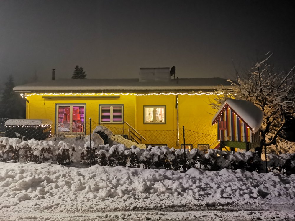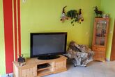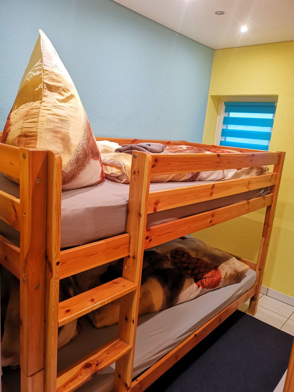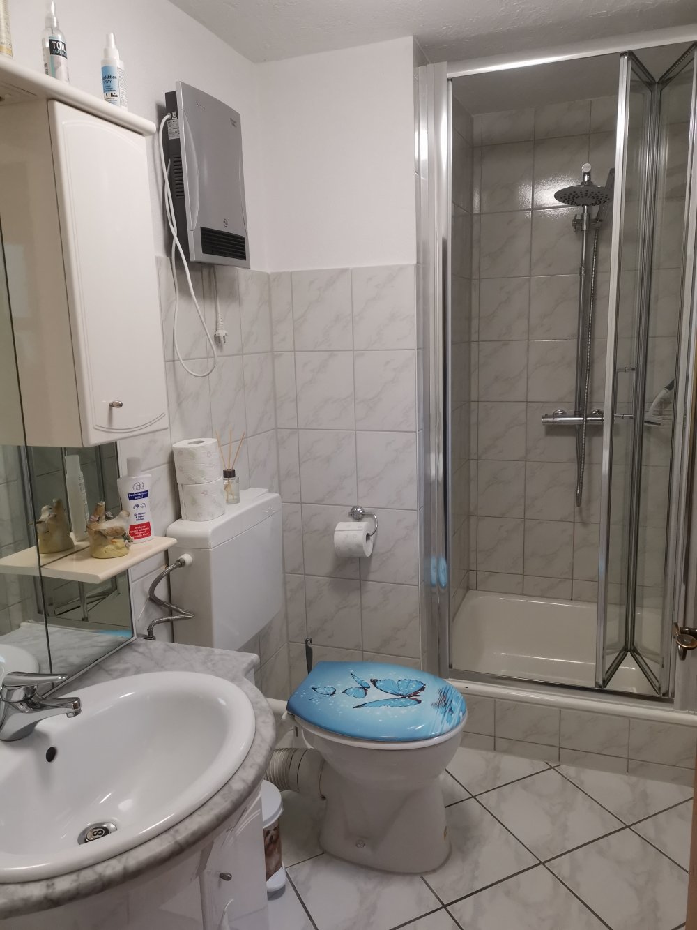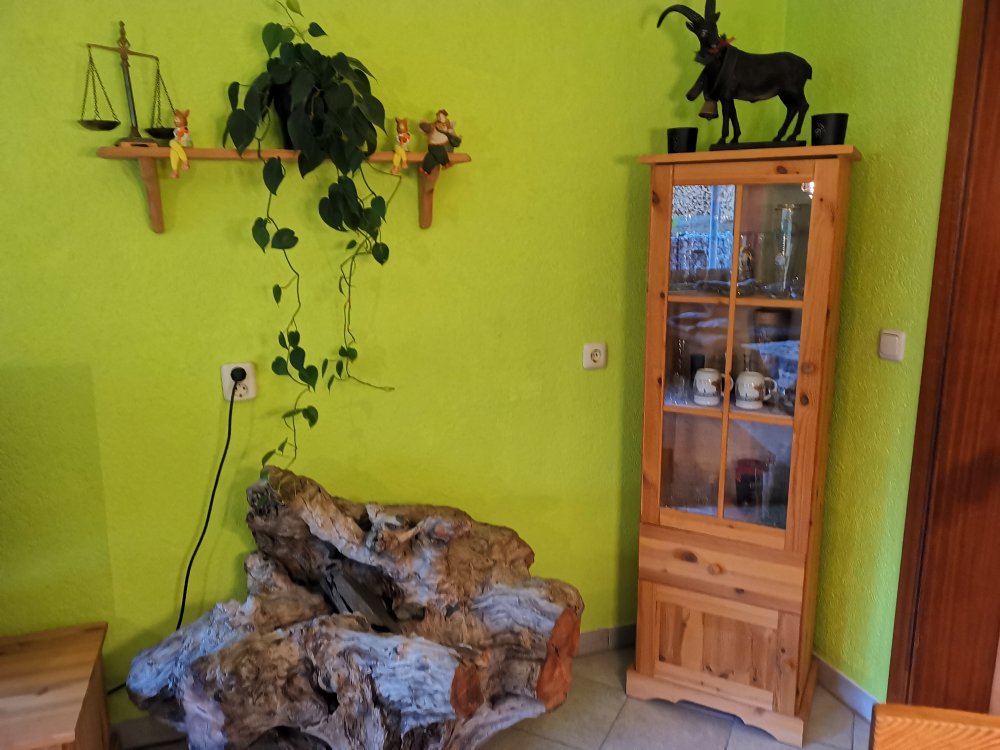 Die Ferienwohnung befindet sich im Untergeschoss unseres Einfamilienhauses. Um zu ihrem seperaten Eingang zu kommen, müssen Sie drei Stufen hinunter gehen. Es bsteht aber auch die Möglichkeit die Ferienwohnung über ihre Terrassentür zu erreichen. In dem Fall müssen Sie keine Stufen überwinden. Der Boden ist vollständig gefliest, ohne Fußbodenheizung. Im Winter werden Hausschuhe empfohlen.Im Flur befindet sich ein Kamin, welcher sehr gern mit unserem Holz kostenfrei geheizt werden kann. In der Wohnung befinden sich zwei Schlafzimmer. 1x mit Doppelbett Größe 1,60m x 2,00m. Im zweiten Schlafzimmer steht ein Doppelstockbett, welches auch für junge Erwachsene geeignet ist. Die Schlafzimmer sind klein. Zum Schlafen reicht dies jedoch völlig aus. Vom Flur aus, gelangen Sie ins Badezimmer mit Fenster. Hier finden Sie eine Dusche, WC, und Waschbecken mit Spiegel. Im offenen Wohn-Essbereich finden Sie eine gemütliche Eckcouch, welche bei Bedarf zu einer Schlafcouch mit zwei Schlafgelegenheiten ausgezogen werden kann. Am Eßtisch befinden sich 4 Stühle, bei einer Belegung mit mehr als 4 Personen werden von uns weitere Stühle bereitgestellt.