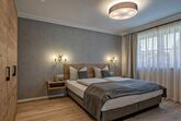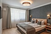 Schlafzimmer mit großem Schrank aus Eichenholz (inkl. Tresor), Kofferablage, Garderobe mit Beleuchtung, Boxspring-Doppelbett und Smart-TV.