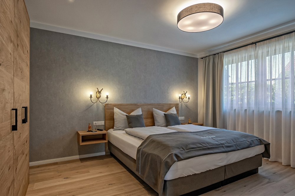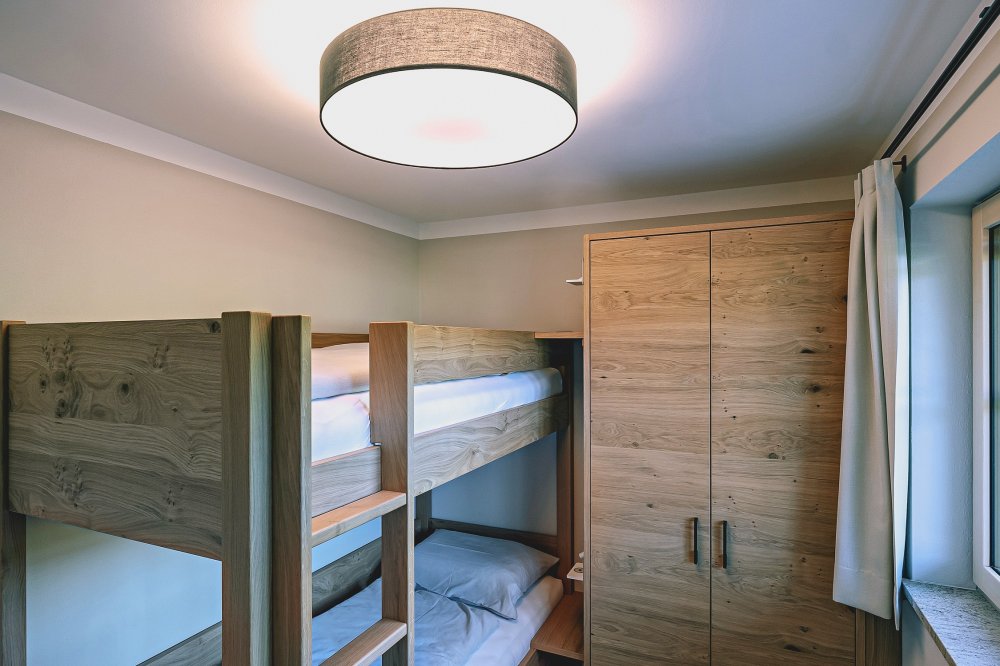 Insgesamt bietet das Chalet Almwiese drei Schlafzimmer, davon sind zwei mit einem Boxspring-Doppelbett ausgestattet und ein Schlafzimmer mit einem Zwei-Etagen-Stockbett für Eure Kinder.Das Schreiner-Stockbett mit Leselicht und der Eichenholz-Kleiderschrank begeistert alle Kinder. Wir haben hier zur Sicherheit eurer Kleinen extra pro Ebene eine Niedervolt-Lademöglichkeit für Akkugeräte und stabile Seitenbretter vorgesehen.
