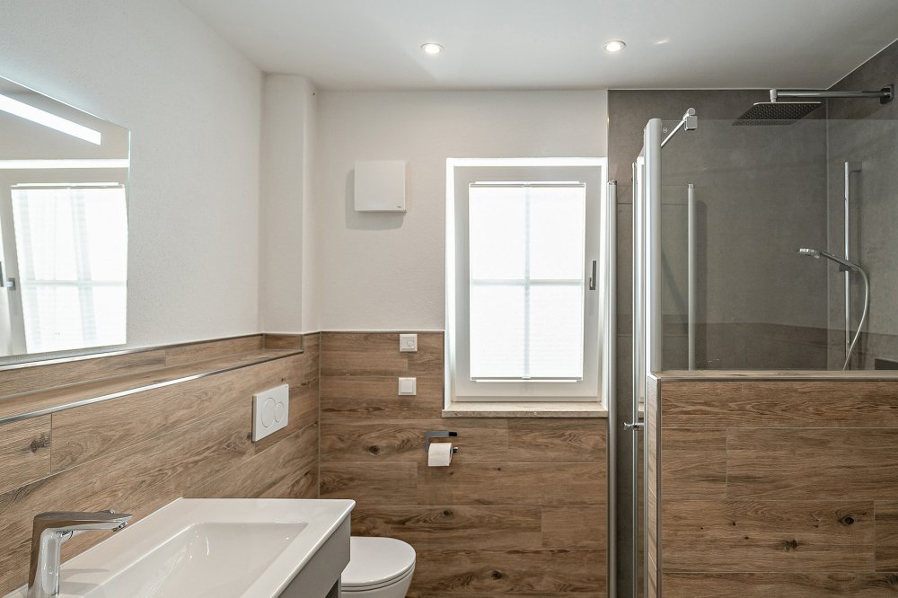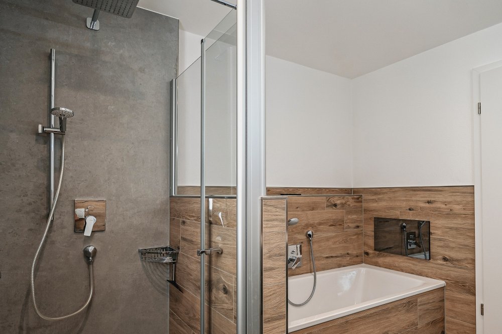 Die beiden Badezimmer bieten Euch jeweils eine bodengleiche Rainshower-Dusche, einen großen Waschtisch sowie eine Toilette. Zusätzlich ist eines der Bäder mit einer separaten Badewanne sowie einem Spiegel-Smart-TV ausgestattet.