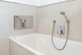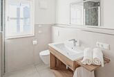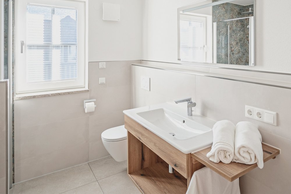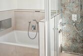 Tageslicht-Bad mit bodengleicher Rainshower-Dusche und Badewanne mit Spiegel-Smart-TV sowie Designwaschtisch mit beleuchtetem Großformat-Spiegel und Handtuchtrockner.