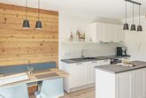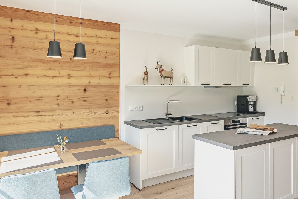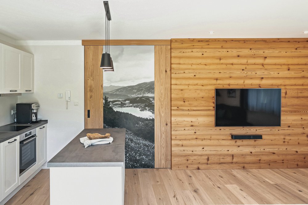 Der kombinierte Wohnbereich verfügt über eine tolle Schreinerküche mit Mittelblock, einer Show-Altholzrückwand mit großem Smart-TV und einer integrierten Eichenholz-Schiebetüre. Dieser einzigartige Essplatz bietet Platz für 4 Personen.