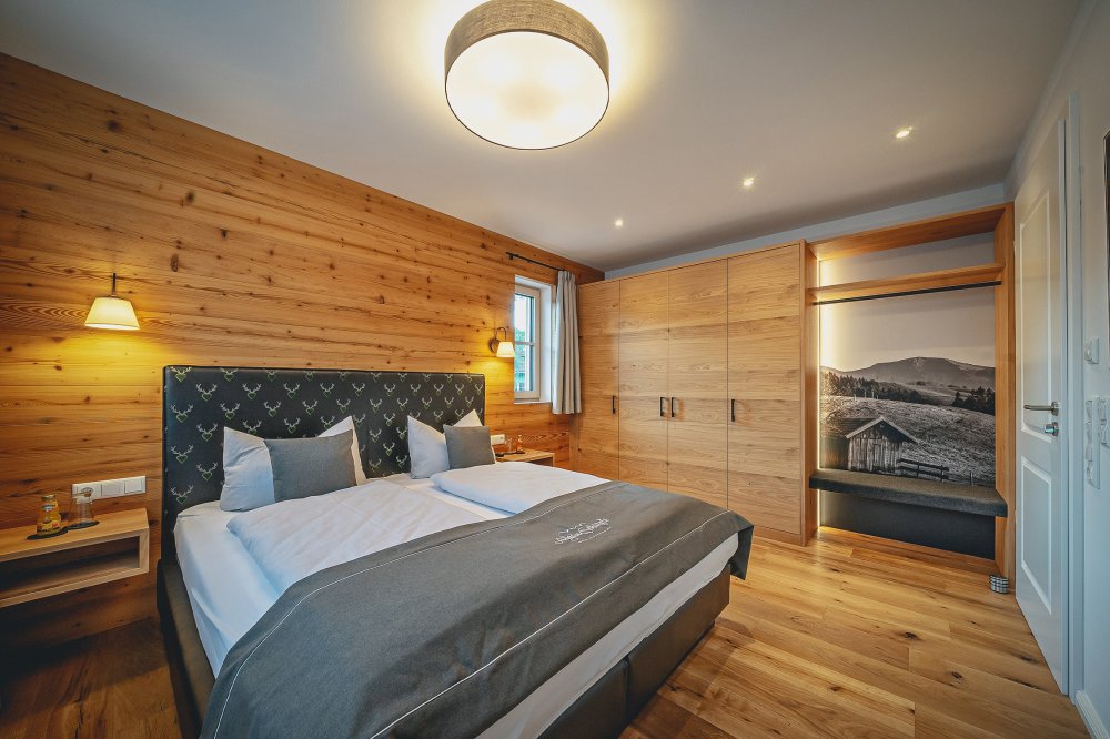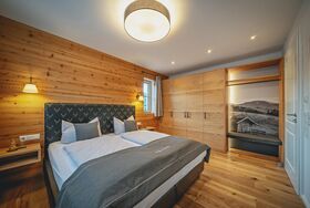 Schlafzimmer mit großem Schrank aus Eichenholz (inkl. Tresor), Kofferablage, Garderobe mit Beleuchtung, Boxspring-Doppelbett und Smart-TV.