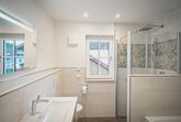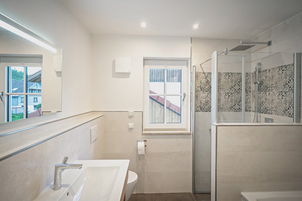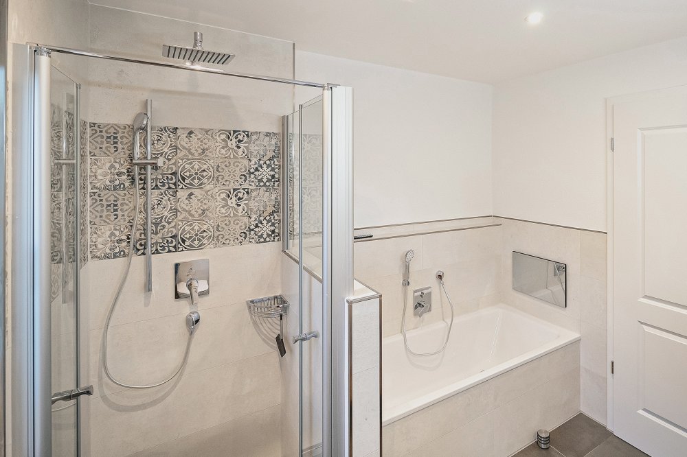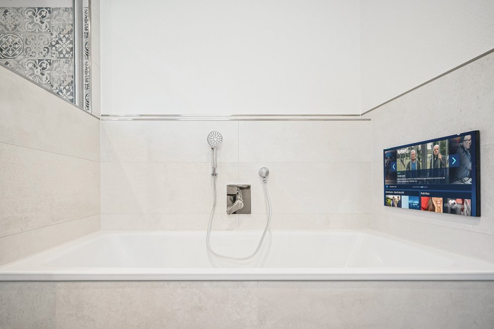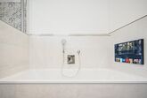 Tageslicht-Bad mit bodengleicher Rainshower-Dusche und Badewanne mit Spiegel-Smart-TV sowie Designwaschtisch mit beleuchtetem Großformat-Spiegel und Handtuchtrockner.