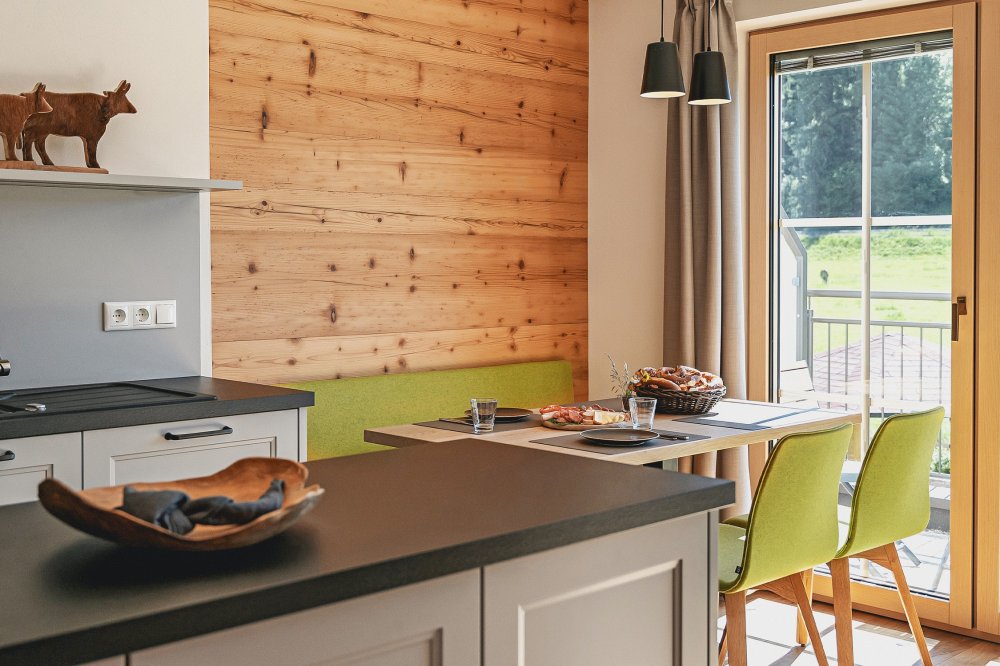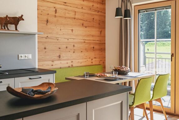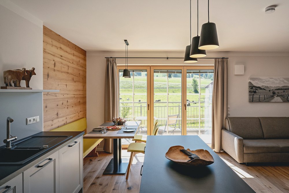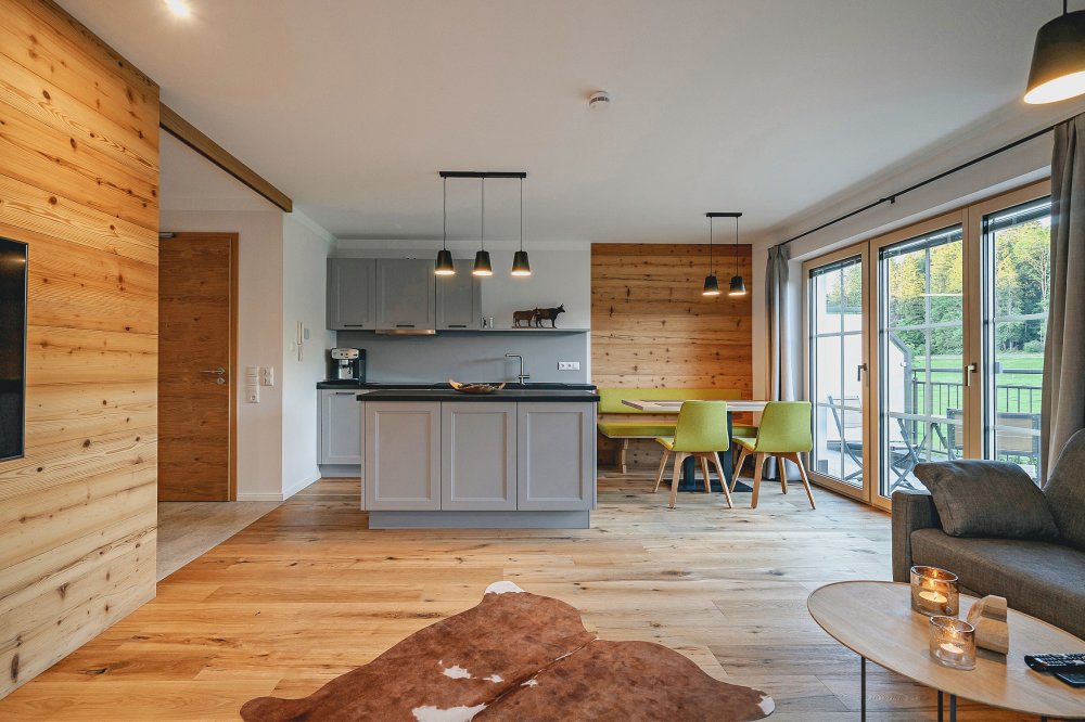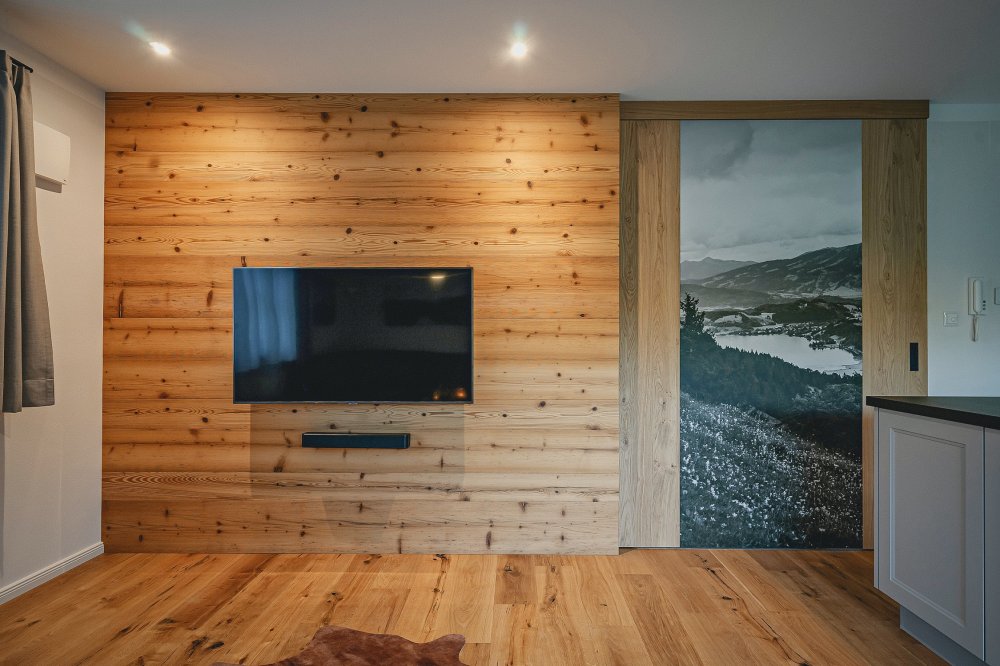 Der kombinierte Wohnbereich verfügt über eine tolle Schreinerküche mit Mittelblock, einer Show-Altholzrückwand mit großem Smart-TV und einer integrierten Eichenholz-Schiebetüre. Dieser einzigartige Essplatz bietet Platz für 4 Personen.