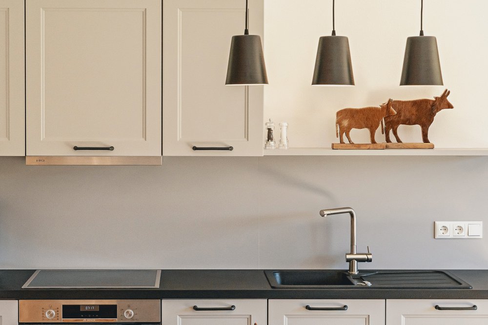 Maßgefertigte Küche mit 4-Feld-Induktionsherd, Dunstabzugshaube, Kühlschrank mit Gefrierfach und Spül- und Kaffeemaschine.