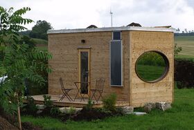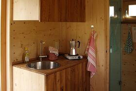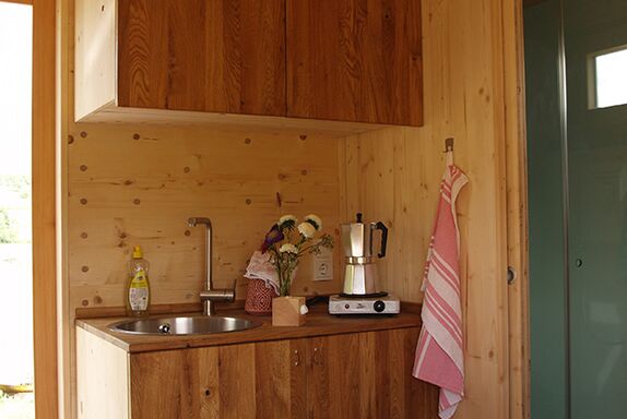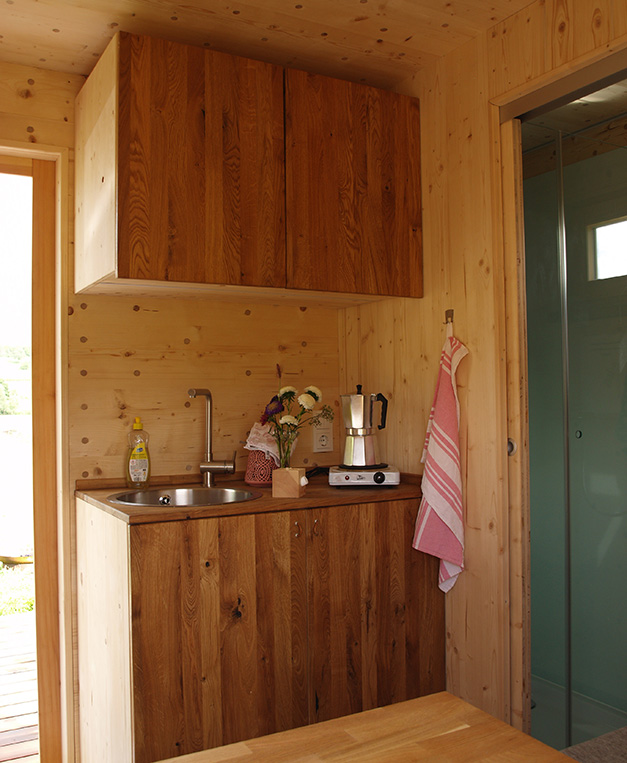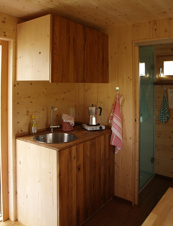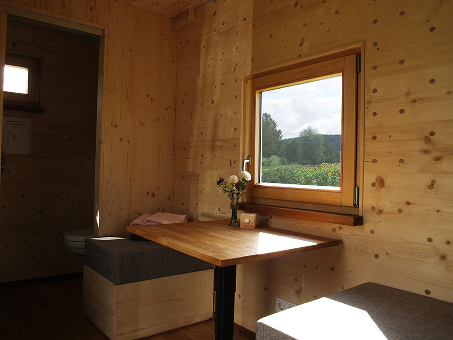 Unser Zinipi ist aus 100% Holz (Holz100 von Thoma). Der Innenausbau ist mit Zirbenholz gemacht. Durch die leim- und Schraubenfreie Bauweise garantieren wir für ein einmaliges Wohlfühlklima. Du schläfst in einem 1,60 m breitem Bett mit direkter Aussicht in die Natur durch das wunderschöne Panoramafenster (Bullauge). Unser Zinipi ist mit einer eigenen Nasszelle inkl. WC und Dusche ausgestattet. Außerdem gibt es eine mobile Kochplatte.