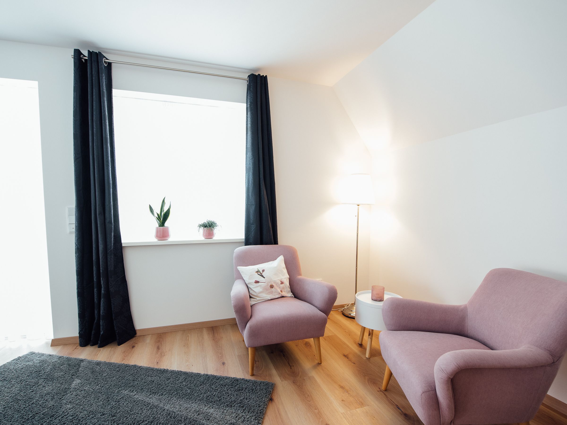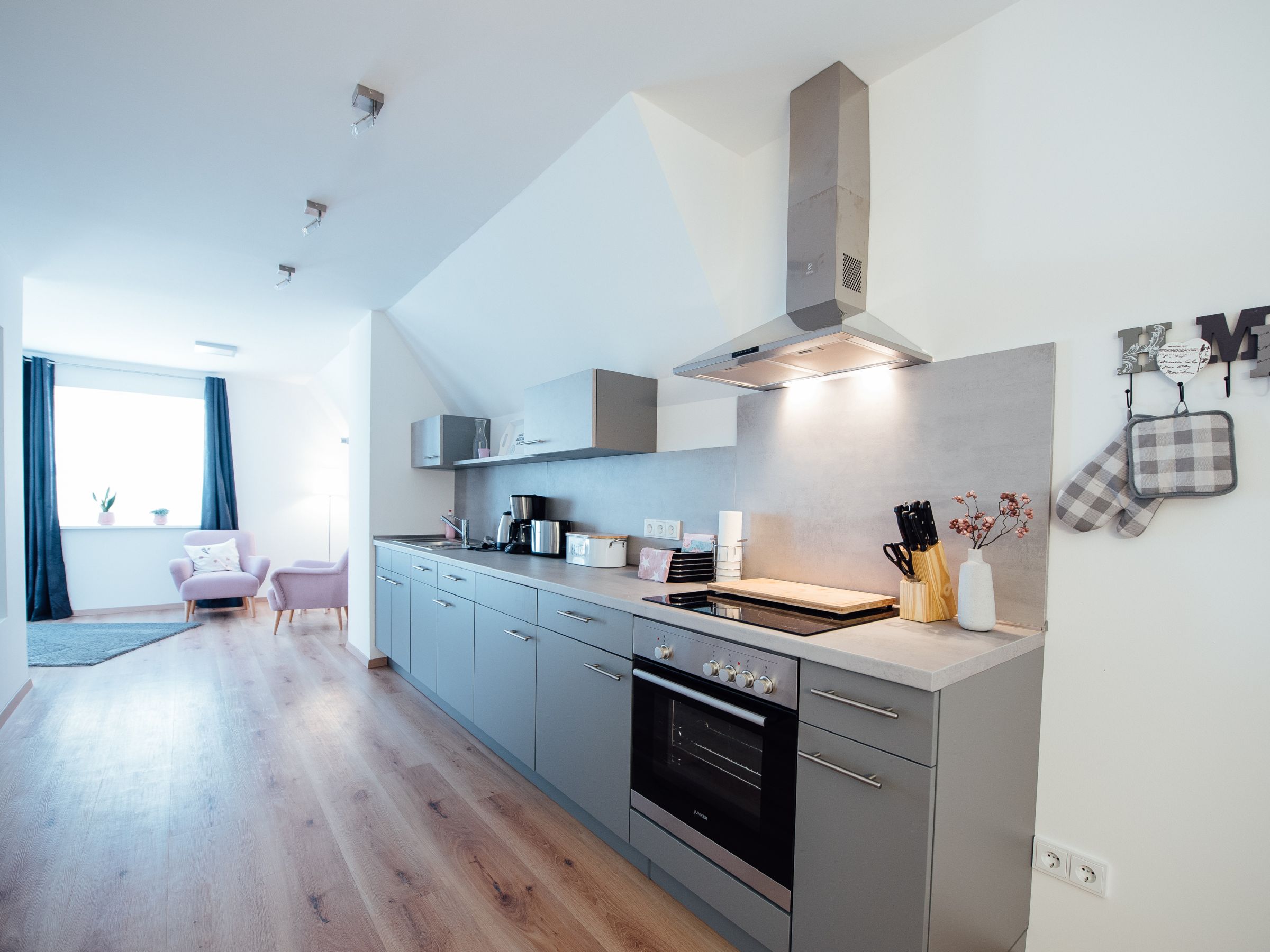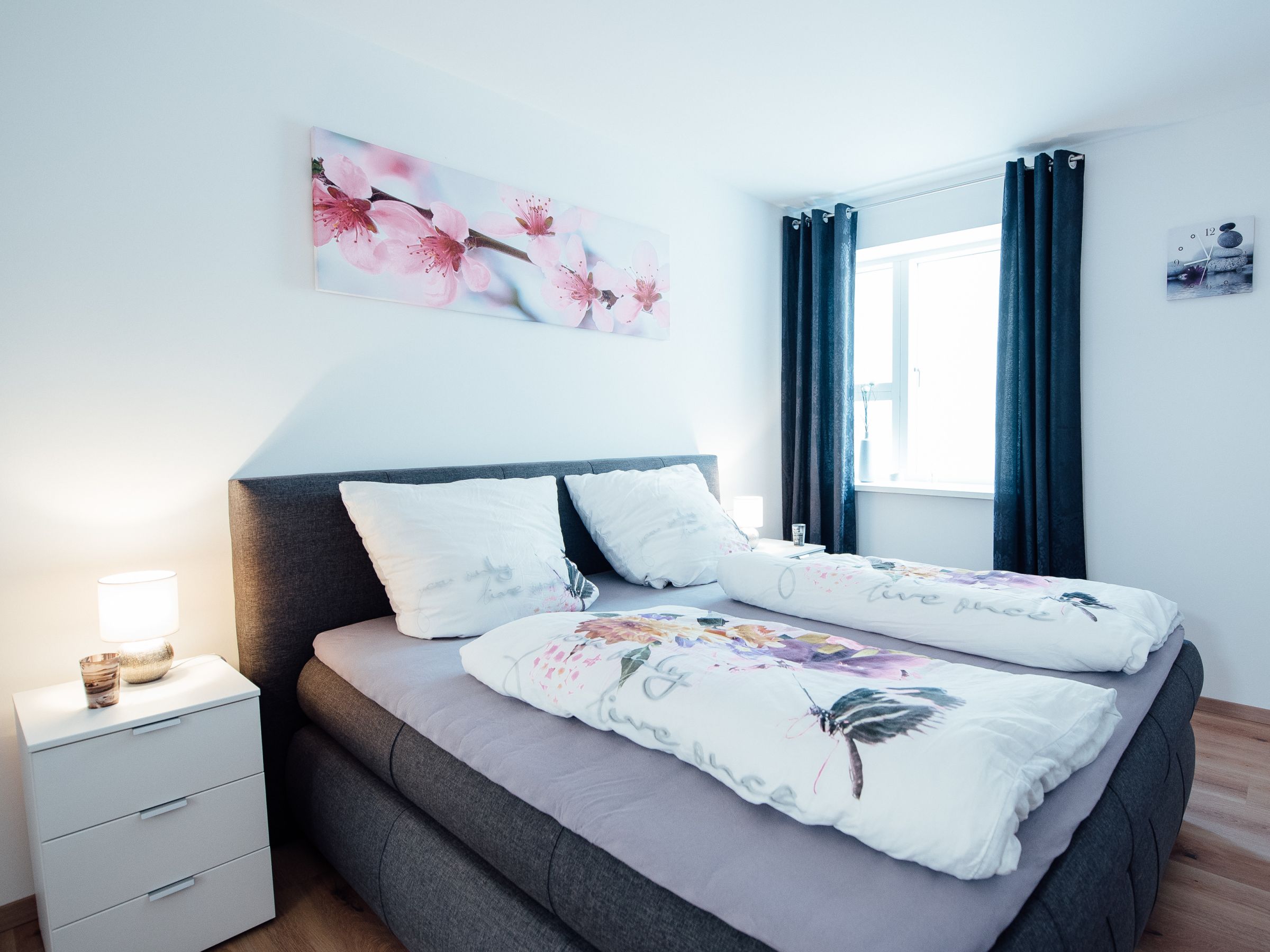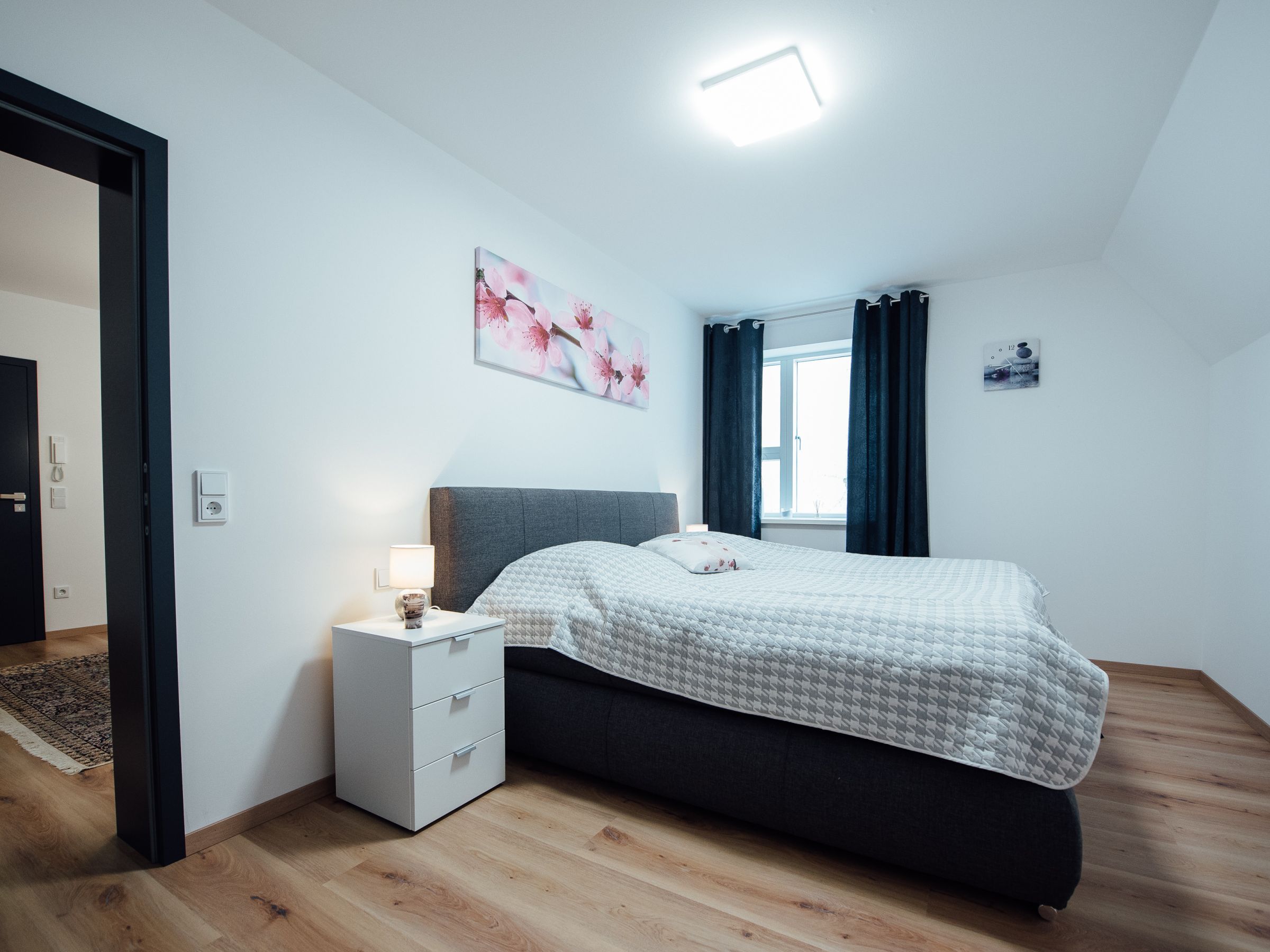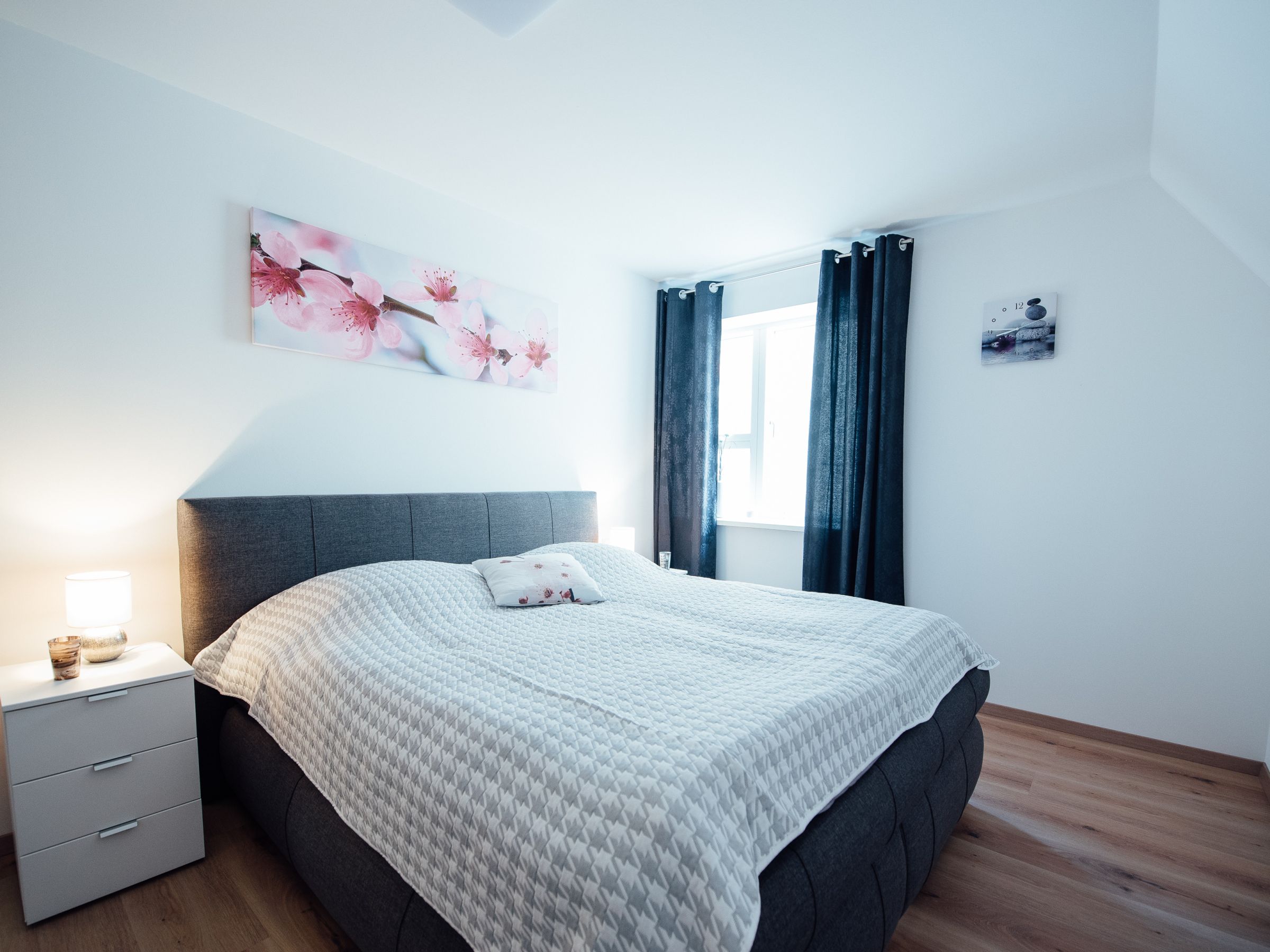 Die 76qm große Ferienwohnung für 2 Personen im 1. Stock verfügt über 1 Schlafzimmer mit Boxspringbett und Ankleidezimmer. Das Badezimmer ist mit einer Wellnessdusche und hochwertigen Möbel ausgestattet. Der helle Wohnbereich ist durch einer gemütlichen Leseecke mit dem Essbereich verbunden. Eine voll ausgestattete Küchenzeile mit Elektroherd, Ceranfeld u. Backofen, Spülmaschine, Kaffeemaschine, Toaster u. Wasserkocher lädt zum Kochen ein. Vom Wohnbereich kommen sie auf eine große Terrasse mit Lounge Möbel und ein Ampelschirm sorgt für Schatten. Die Terrasse teilen Sie mit den Gästen einer zweiten Ferienwohnung. Die Fernsehecke ist mit einem Flachbildschirm und Radio modern und im skandinavischen Stil eingerichtet. Bettwäsche, Handtücher, Geschirrtücher sowie Waschmaschine und Trockner sind vorhanden.