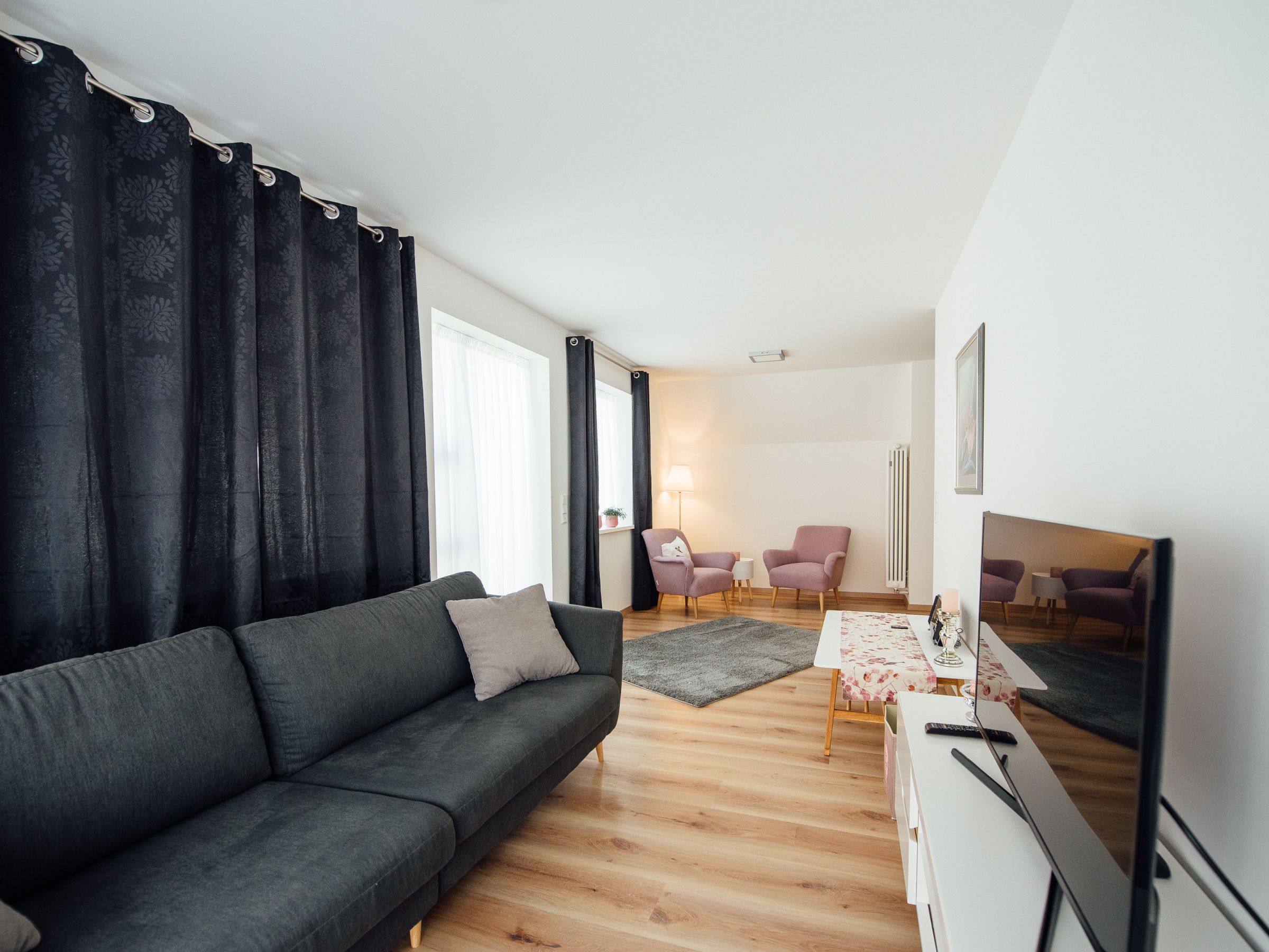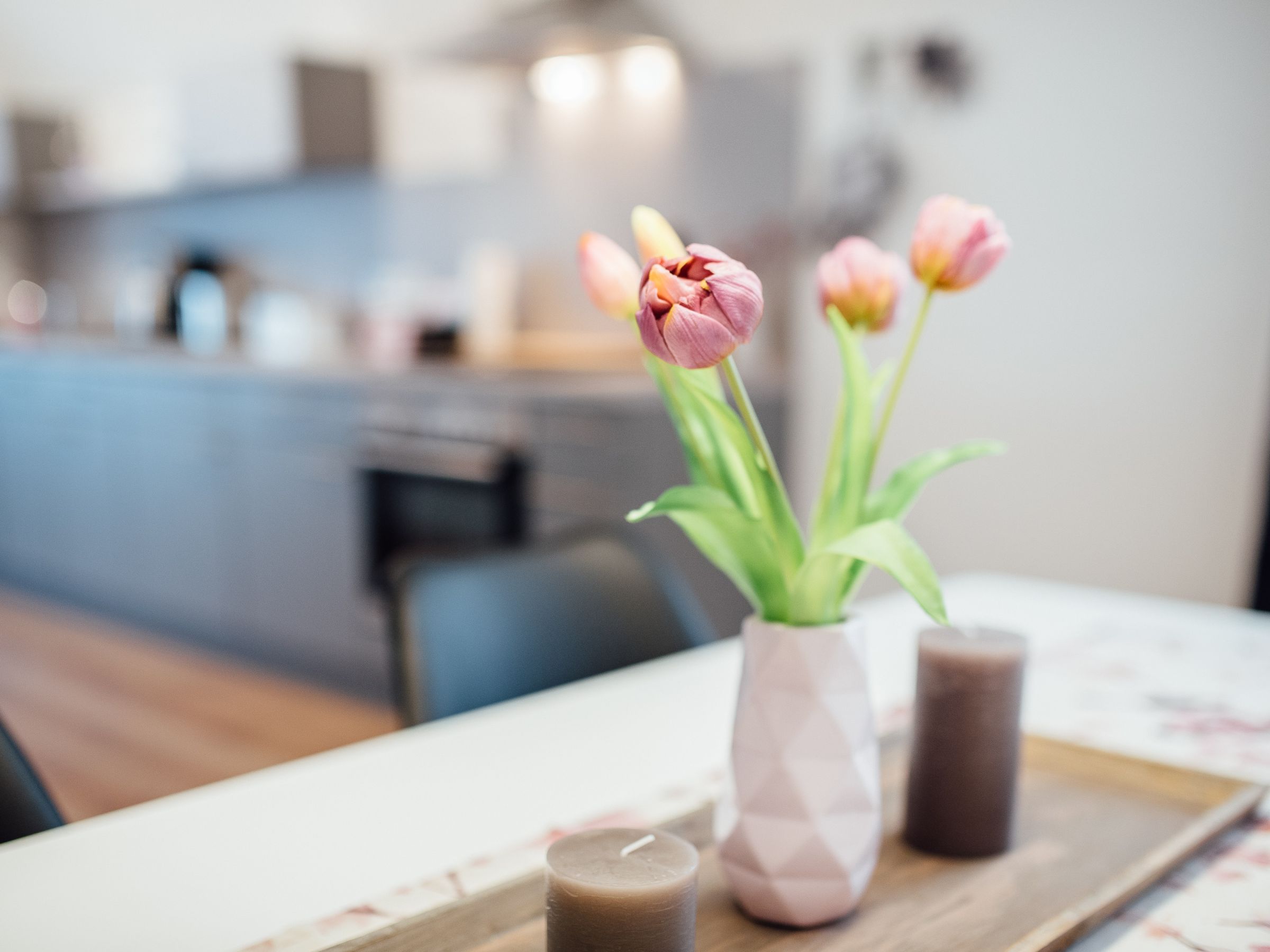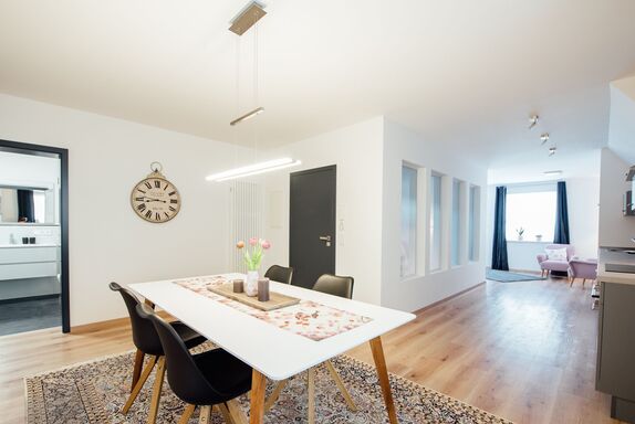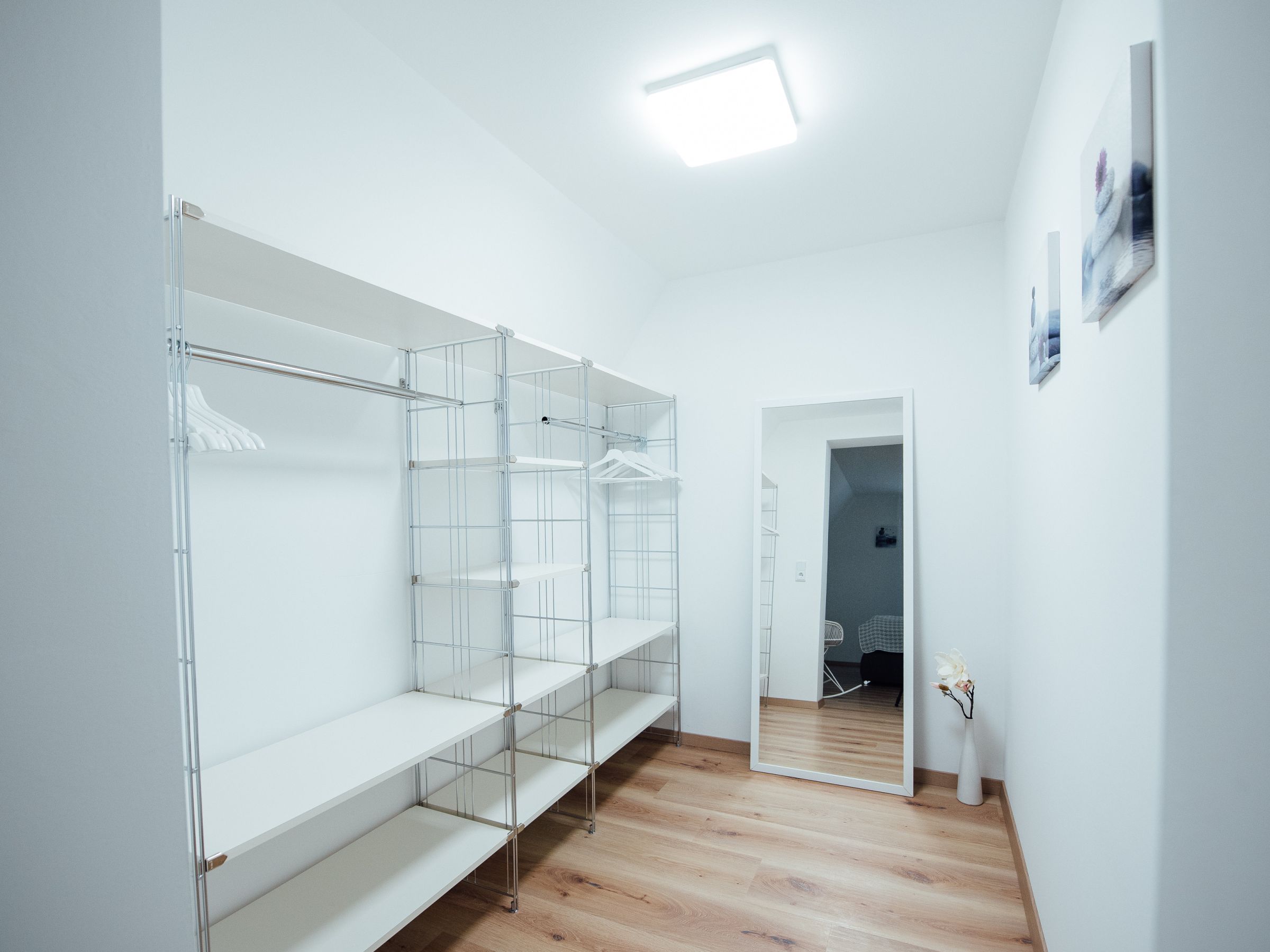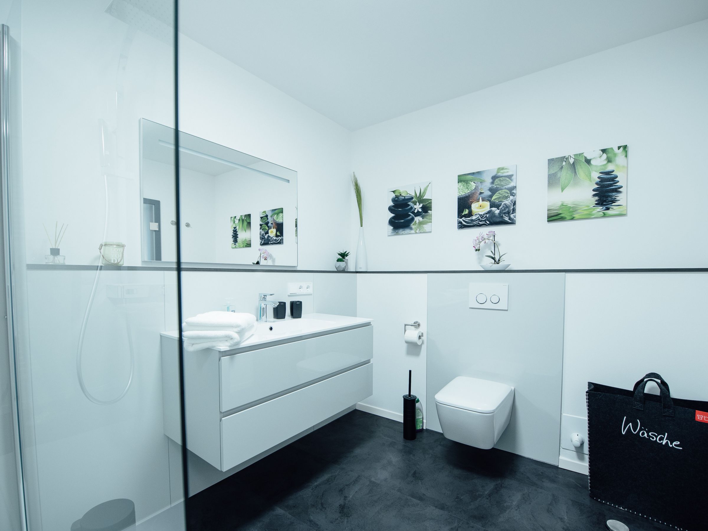 Die 76qm große Ferienwohnung für 2 Personen im 1. Stock verfügt über 1 Schlafzimmer mit Boxspringbett und Ankleidezimmer. Das Badezimmer ist mit einer Wellnessdusche und hochwertigen Möbel ausgestattet. Der helle Wohnbereich ist durch einer gemütlichen Leseecke mit dem Essbereich verbunden. Eine voll ausgestattete Küchenzeile mit Elektroherd, Ceranfeld u. Backofen, Spülmaschine, Kaffeemaschine, Toaster u. Wasserkocher lädt zum Kochen ein. Vom Wohnbereich kommen sie auf eine große Terrasse mit Lounge Möbel und ein Ampelschirm sorgt für Schatten. Die Terrasse teilen Sie mit den Gästen einer zweiten Ferienwohnung. Die Fernsehecke ist mit einem Flachbildschirm und Radio modern und im skandinavischen Stil eingerichtet. Bettwäsche, Handtücher, Geschirrtücher sowie Waschmaschine und Trockner sind vorhanden.