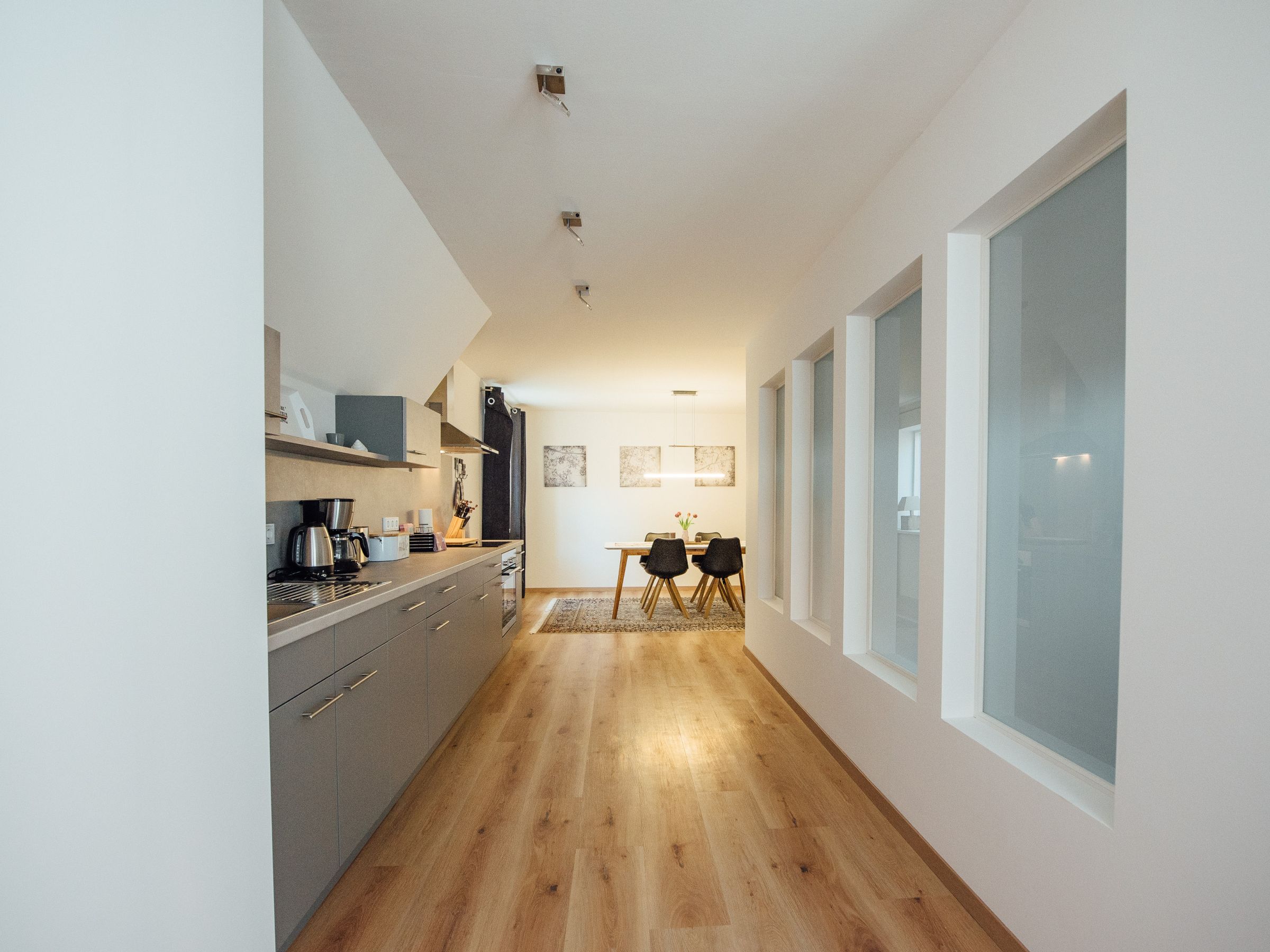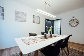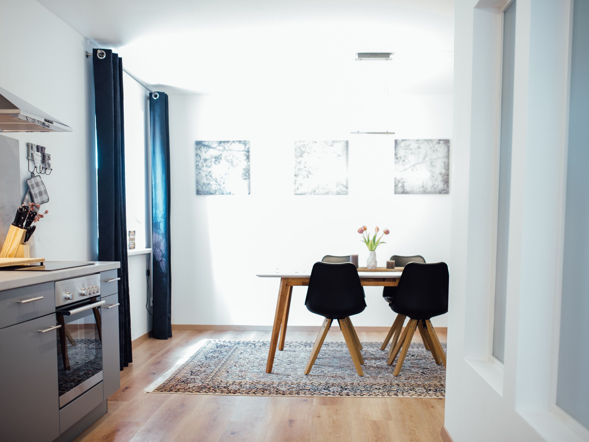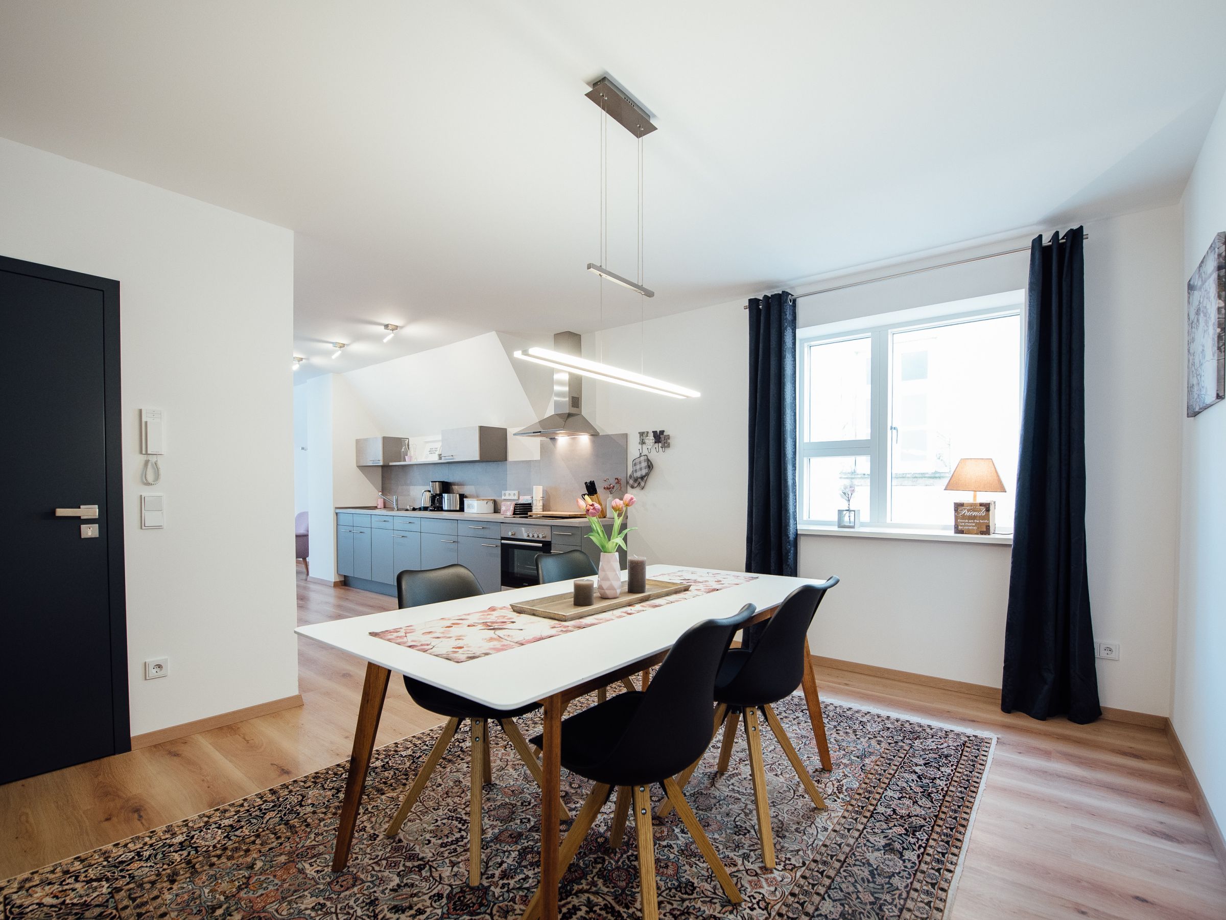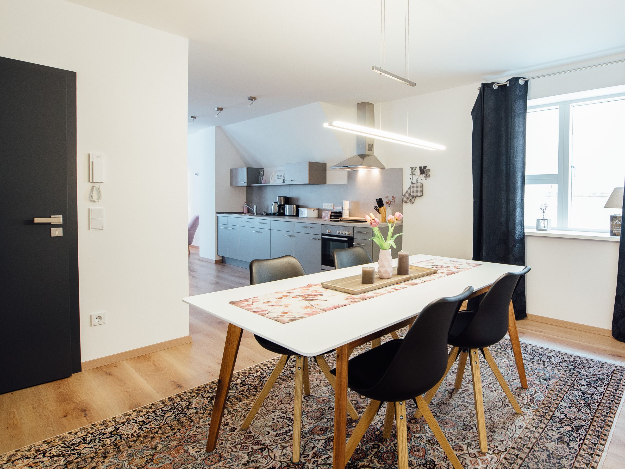 Die 76qm große Ferienwohnung für 2 Personen im 1. Stock verfügt über 1 Schlafzimmer mit Boxspringbett und Ankleidezimmer. Das Badezimmer ist mit einer Wellnessdusche und hochwertigen Möbel ausgestattet. Der helle Wohnbereich ist durch einer gemütlichen Leseecke mit dem Essbereich verbunden. Eine voll ausgestattete Küchenzeile mit Elektroherd, Ceranfeld u. Backofen, Spülmaschine, Kaffeemaschine, Toaster u. Wasserkocher lädt zum Kochen ein. Vom Wohnbereich kommen sie auf eine große Terrasse mit Lounge Möbel und ein Ampelschirm sorgt für Schatten. Die Terrasse teilen Sie mit den Gästen einer zweiten Ferienwohnung. Die Fernsehecke ist mit einem Flachbildschirm und Radio modern und im skandinavischen Stil eingerichtet. Bettwäsche, Handtücher, Geschirrtücher sowie Waschmaschine und Trockner sind vorhanden.