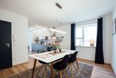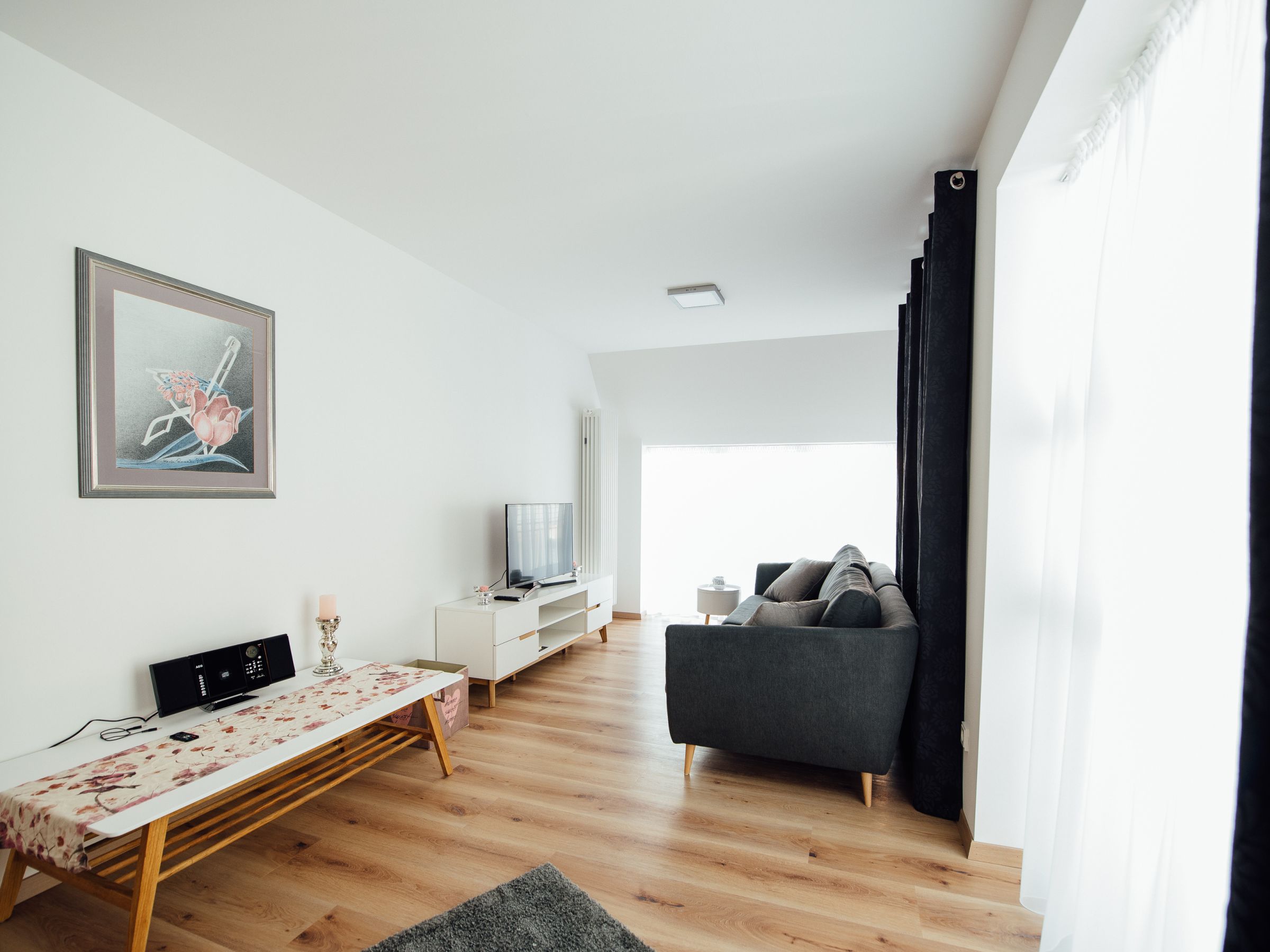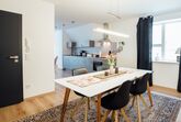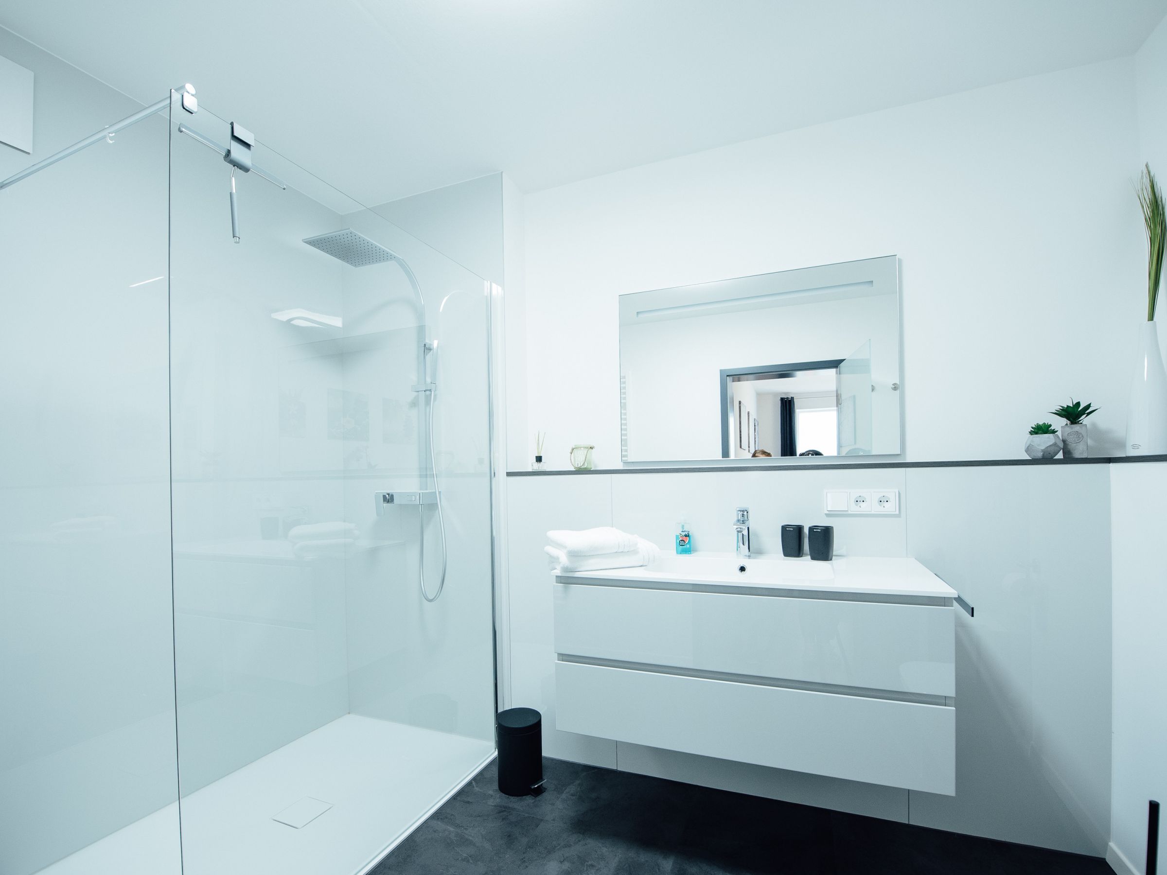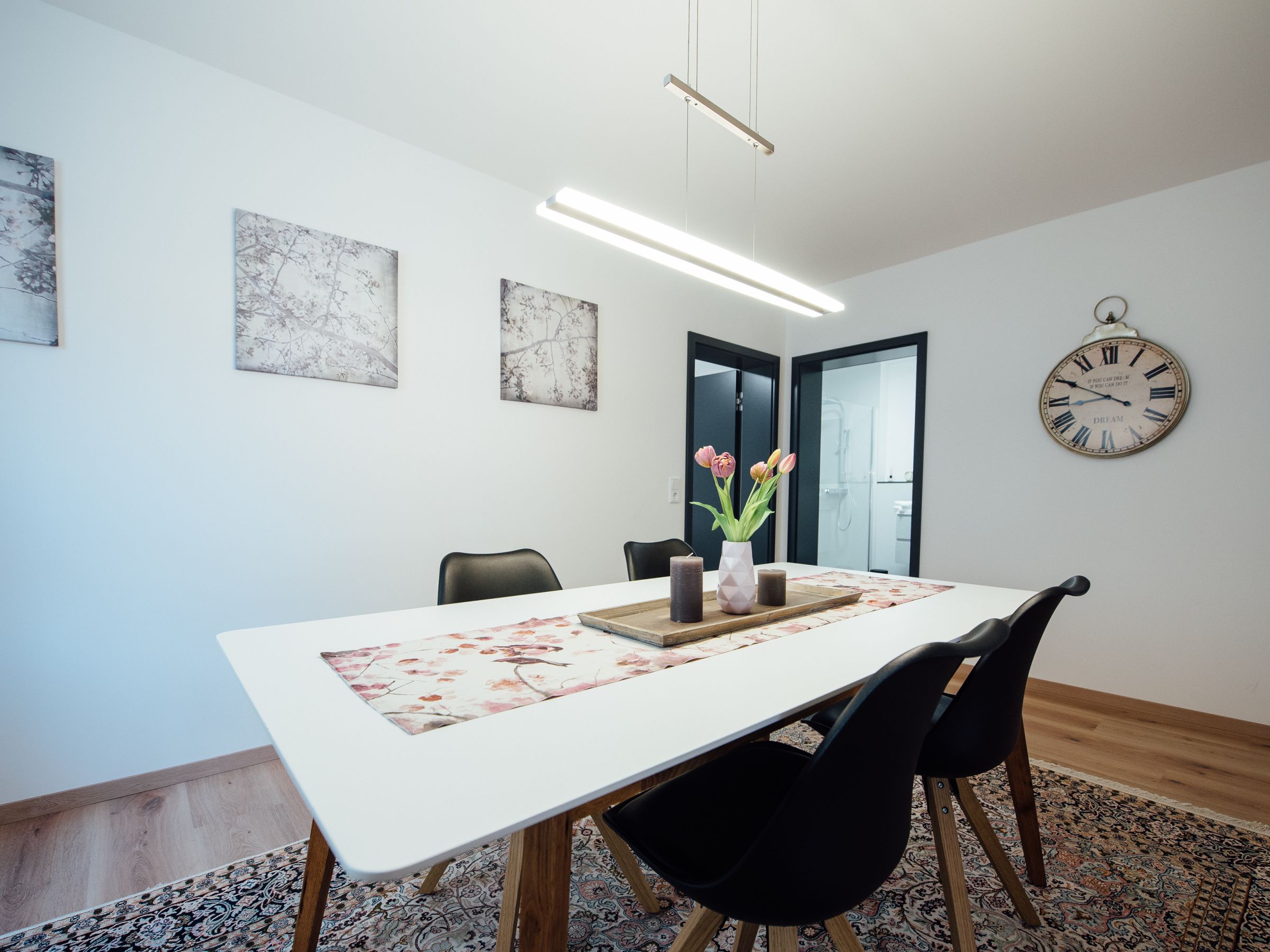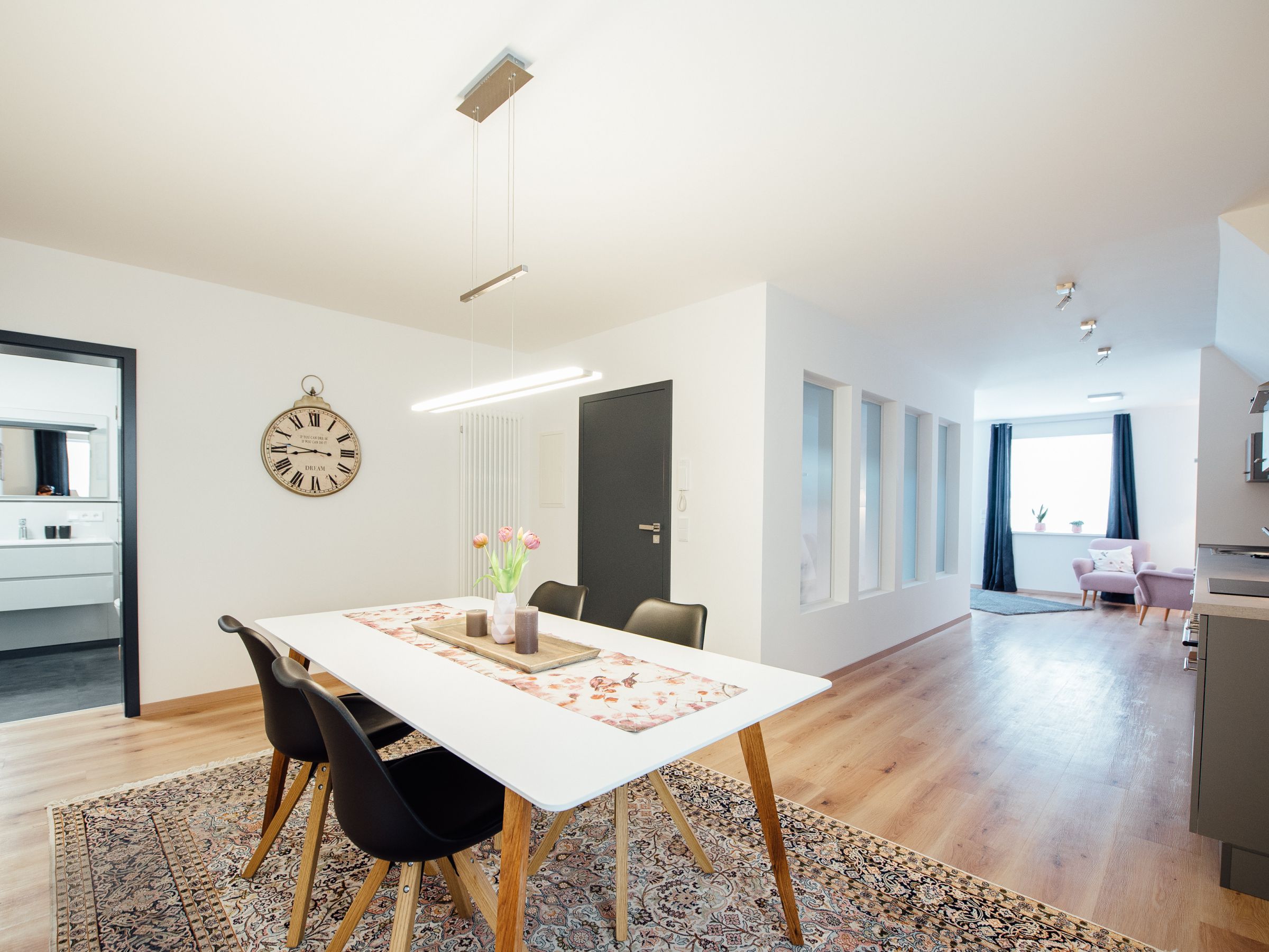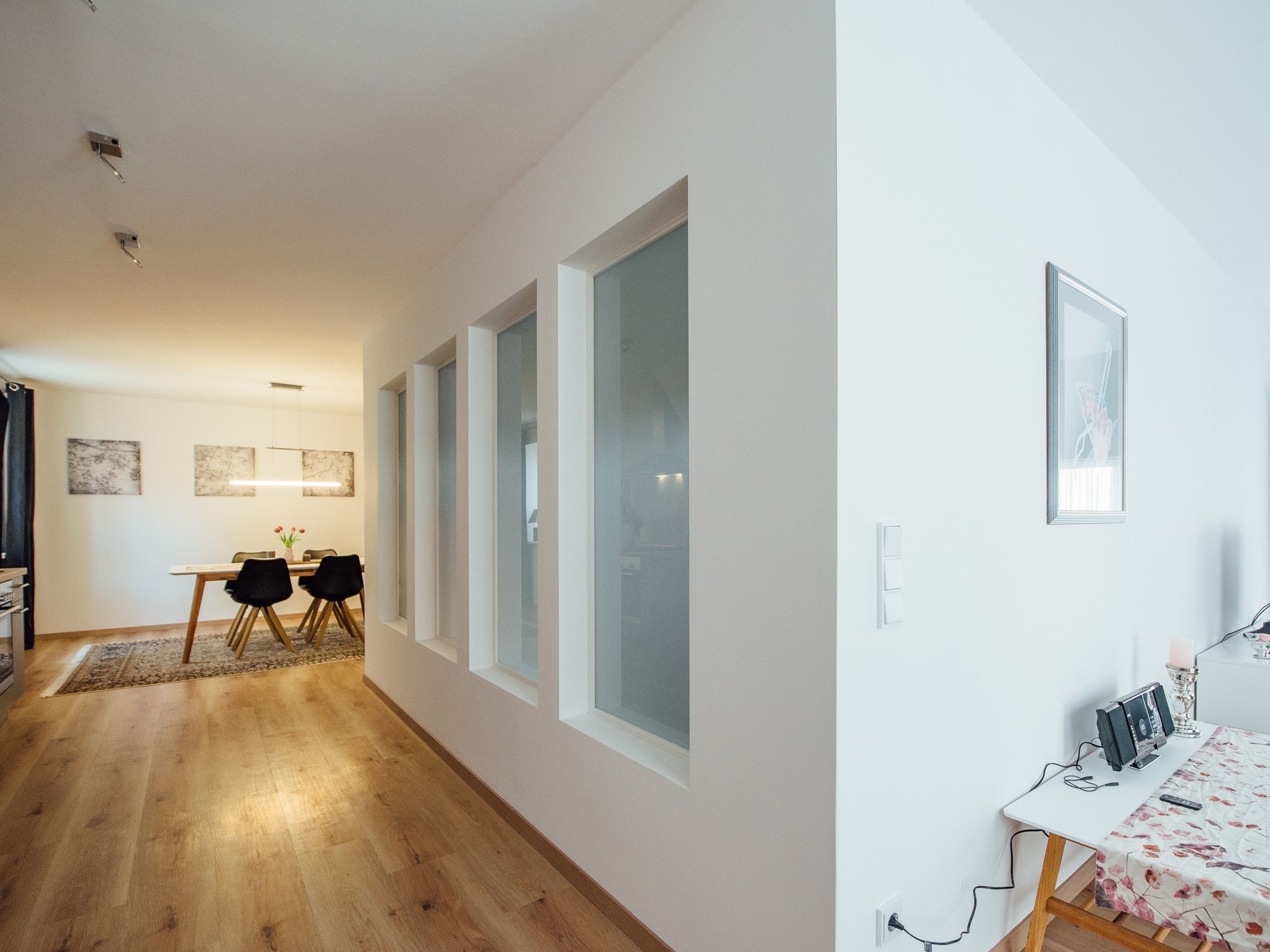 Die 76qm große Ferienwohnung für 2 Personen im 1. Stock verfügt über 1 Schlafzimmer mit Boxspringbett und Ankleidezimmer. Das Badezimmer ist mit einer Wellnessdusche und hochwertigen Möbel ausgestattet. Der helle Wohnbereich ist durch einer gemütlichen Leseecke mit dem Essbereich verbunden. Eine voll ausgestattete Küchenzeile mit Elektroherd, Ceranfeld u. Backofen, Spülmaschine, Kaffeemaschine, Toaster u. Wasserkocher lädt zum Kochen ein. Vom Wohnbereich kommen sie auf eine große Terrasse mit Lounge Möbel und ein Ampelschirm sorgt für Schatten. Die Terrasse teilen Sie mit den Gästen einer zweiten Ferienwohnung. Die Fernsehecke ist mit einem Flachbildschirm und Radio modern und im skandinavischen Stil eingerichtet. Bettwäsche, Handtücher, Geschirrtücher sowie Waschmaschine und Trockner sind vorhanden.