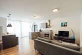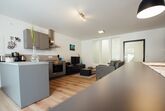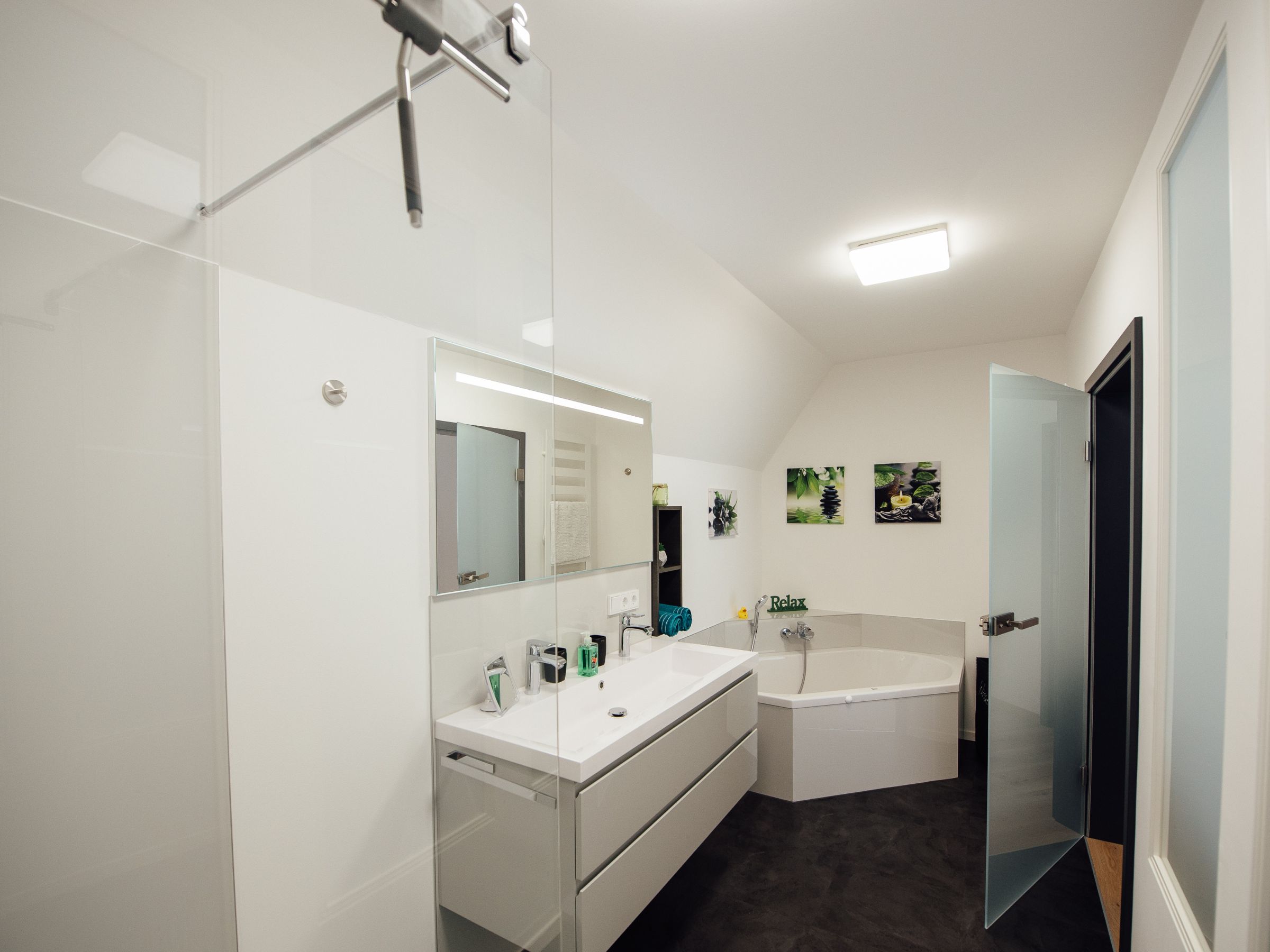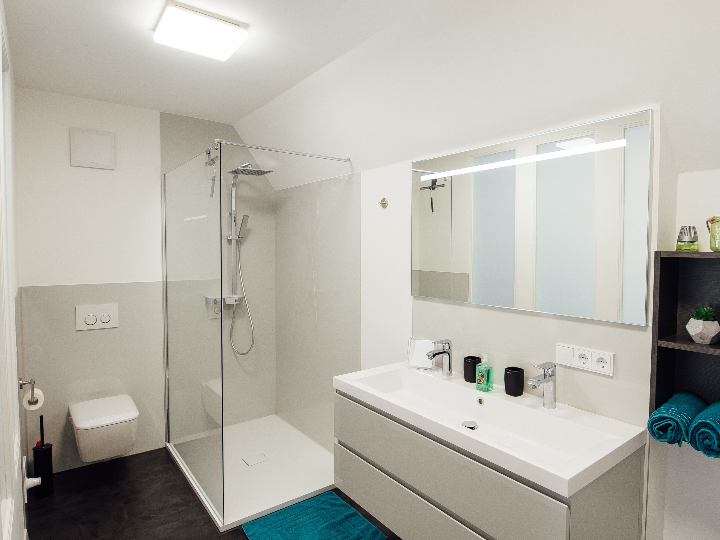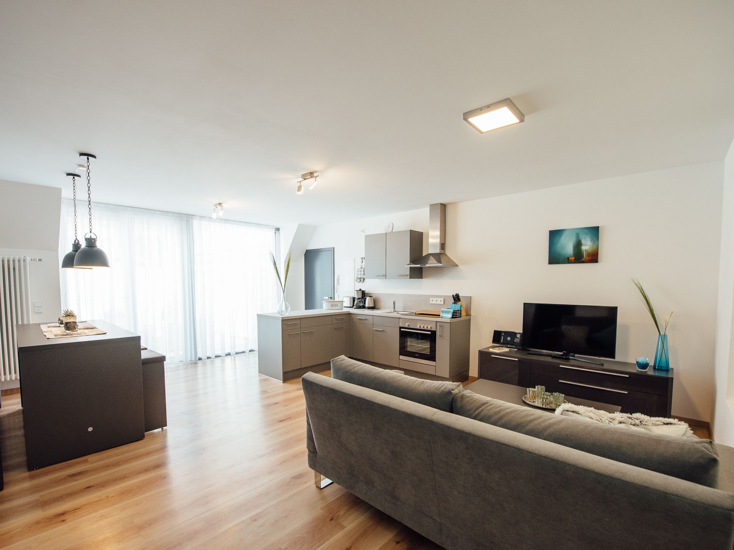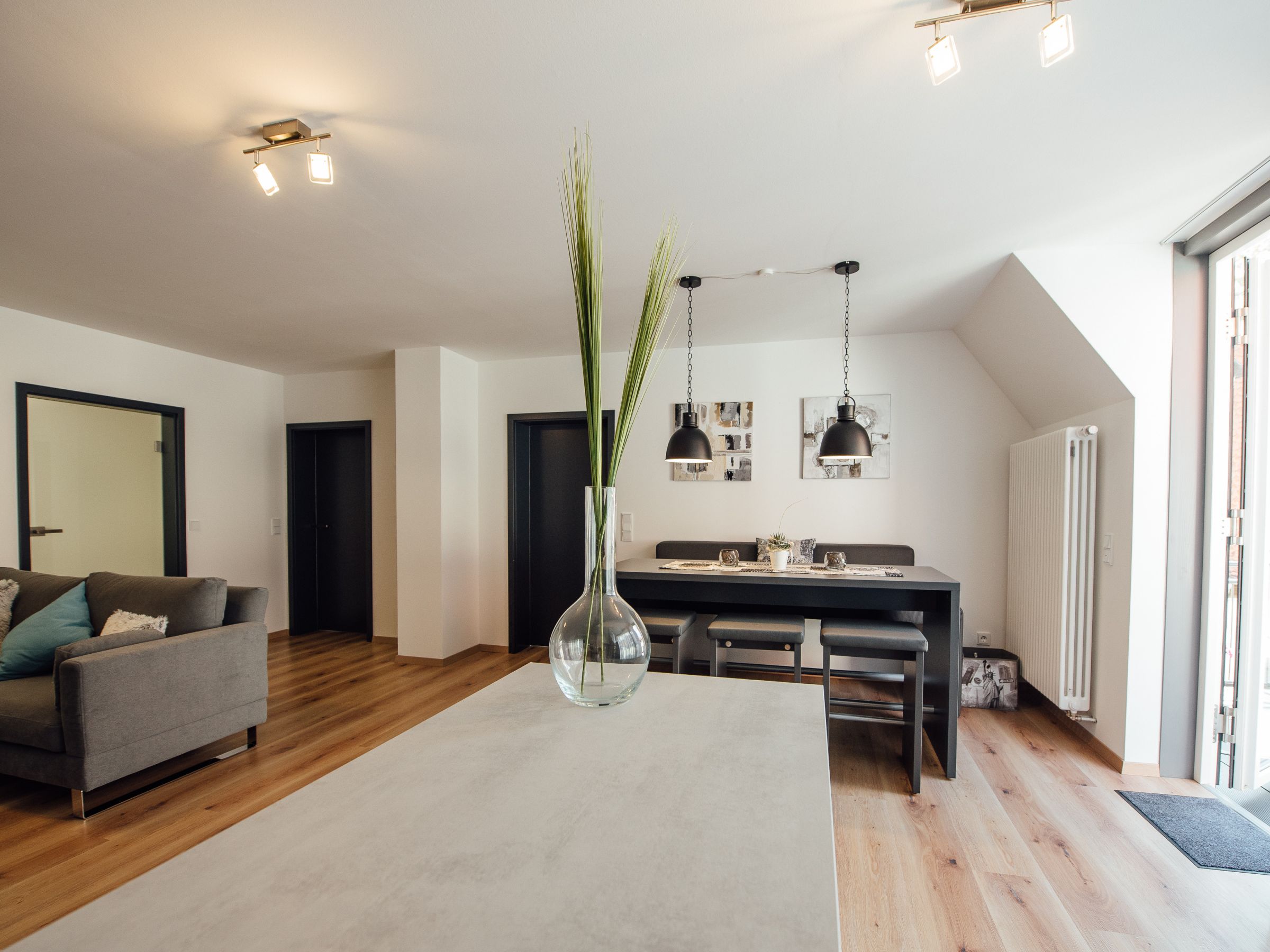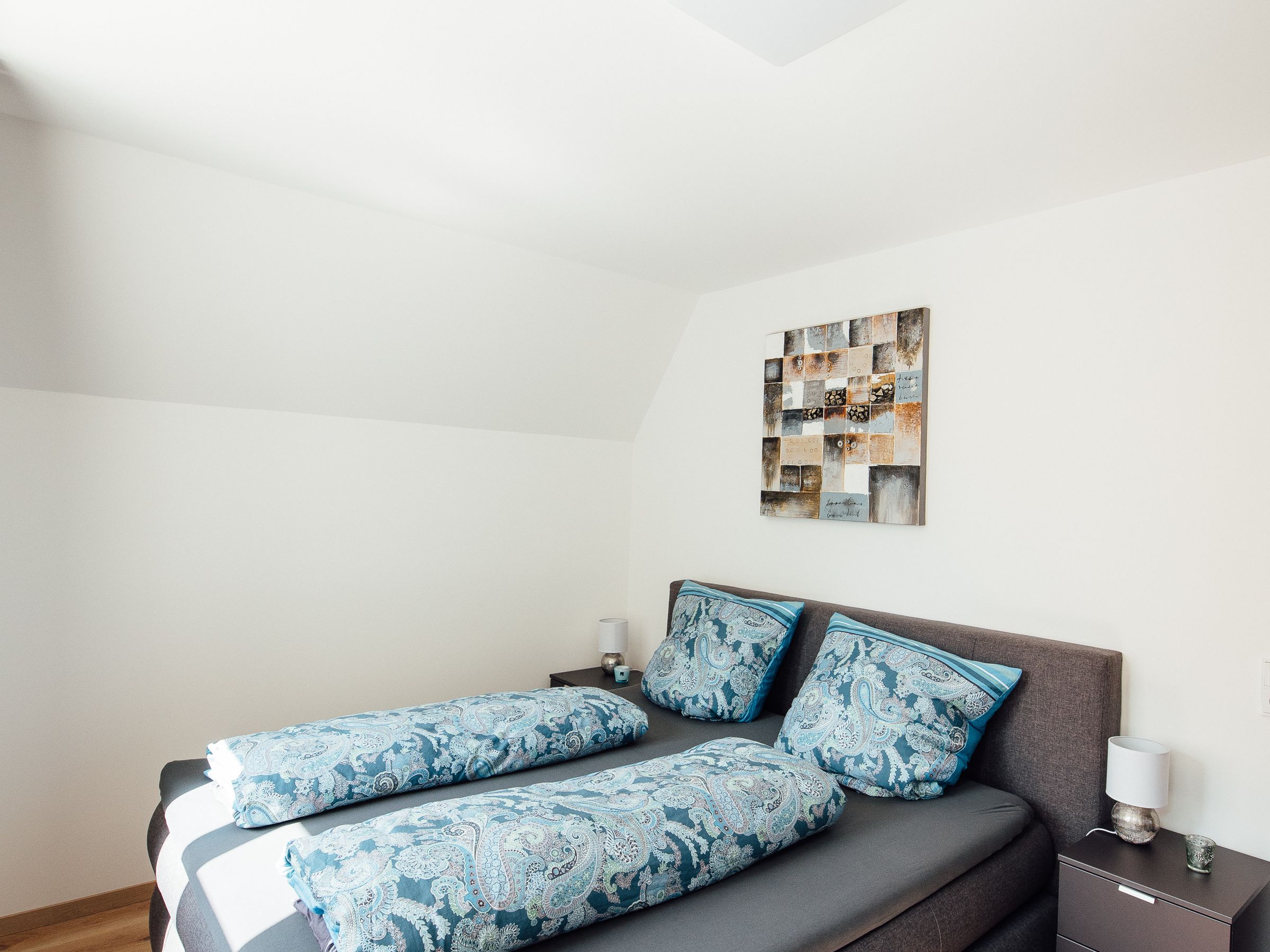 Die 68qm große und helle Ferienwohnung im 1. Stock für 2-4 Pers. verfügt über 1 Schlafzimmer mit Boxspringbett 1,80 m, und 1 Schlafzimmer mit 1,40 m Bett. Das Badezimmer ist mit einer Wellnessdusche sowie einer Badewanne und einem großen Waschbecken mit 2 Wasserhähne und Fön ausgestattet. Eine vollausgestattete Küchenzeile mit Elektroherd, Ceranfeld und Backofen, Spülmaschine sowie Kaffeemaschine, Toaster und Wasserkocher steht für sie bereit. Der helle Wohn- und Essbereich ist sehr modern und geschmackvoll mit Flachbildschirm sowie Radio eingerichtet. Von da aus kommt man auf eine große Terrasse mit Lounge Möbel und Sonnenschirm. Bettwäsche, Handtücher, Geschirrtücher, Waschmaschine und Trockner vorhanden.