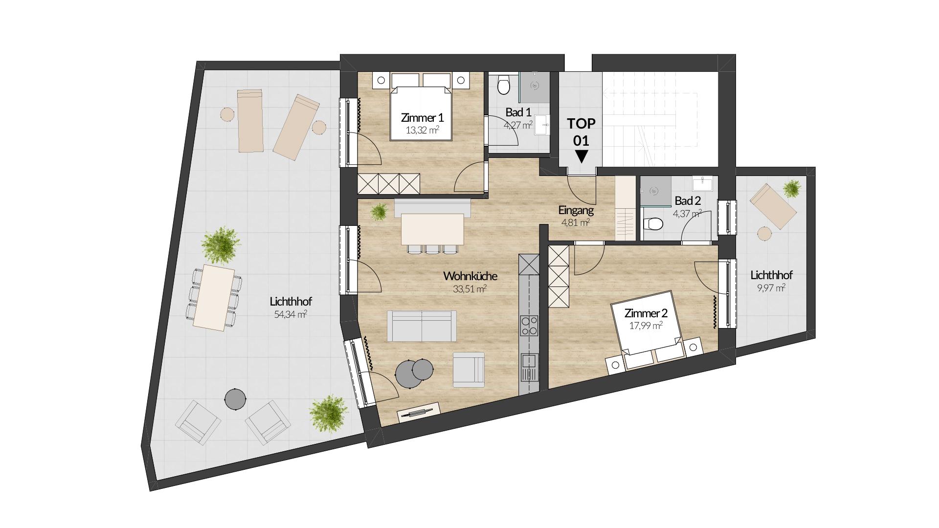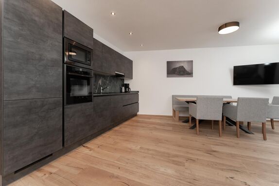 Ca. 78 m² grosses Appartement, voll ausgestattete Küche mit Backrohr, Microwelle, Geschirrspül- und Kaffeemaschine, gemütlicher Esstisch, Kabel TV, Wireless-Lan-Access, großer Wohnraum mit ausziehbarer Sofalandschaft, 2 Schlafzimmer mit Doppelbett, großer Kleiderschrank, 2 Badezimmer mit Dusche und WC,Terrasse im Lichthof.